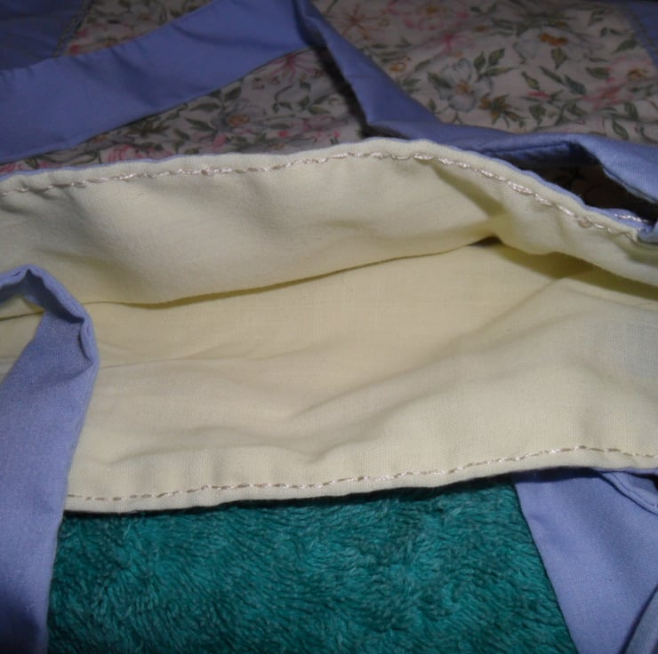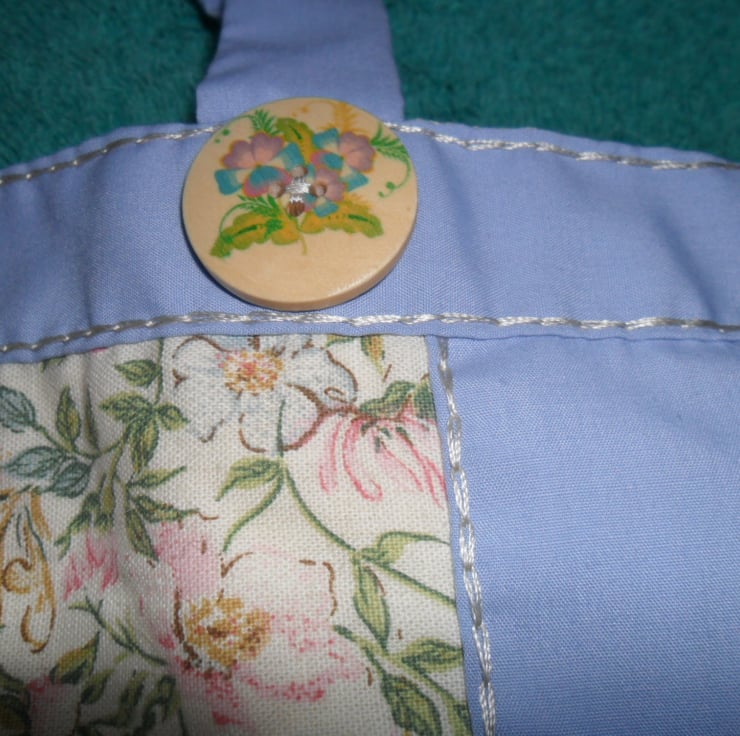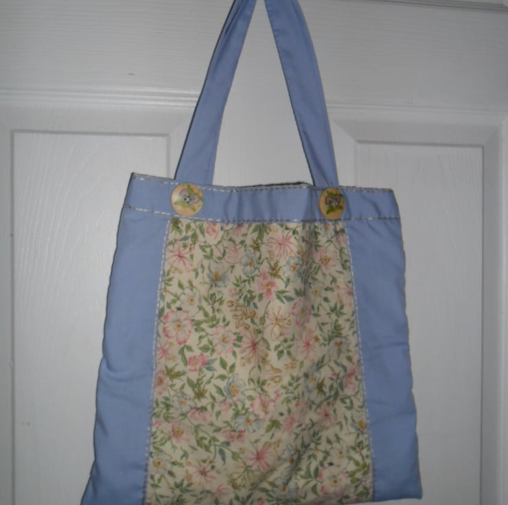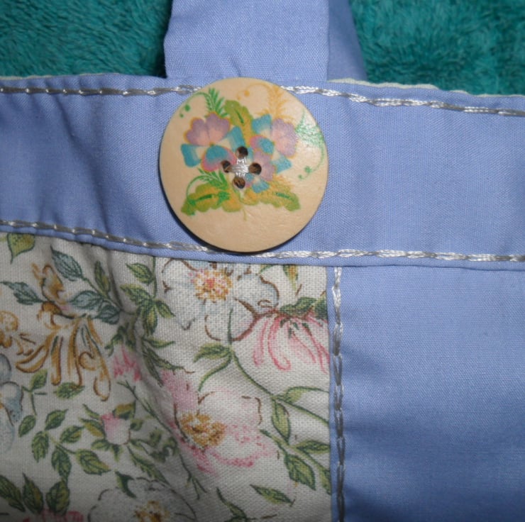A small tote style bag. The centre panel fabric is a floral print from the Country Diary Collection called Honeysuckle and Dog Rose. I have surrounded the centre panel with pale plain blue cotton which I’ve over sewn in a shiny rayon thread in chain stitch. I‘ve used the same hand stitched chain stitch to detail the top of the bag along with four large wooden buttons. I have lined the bag in a yellow cotton and polyester material.