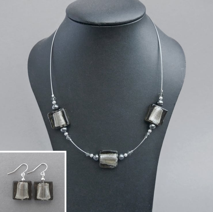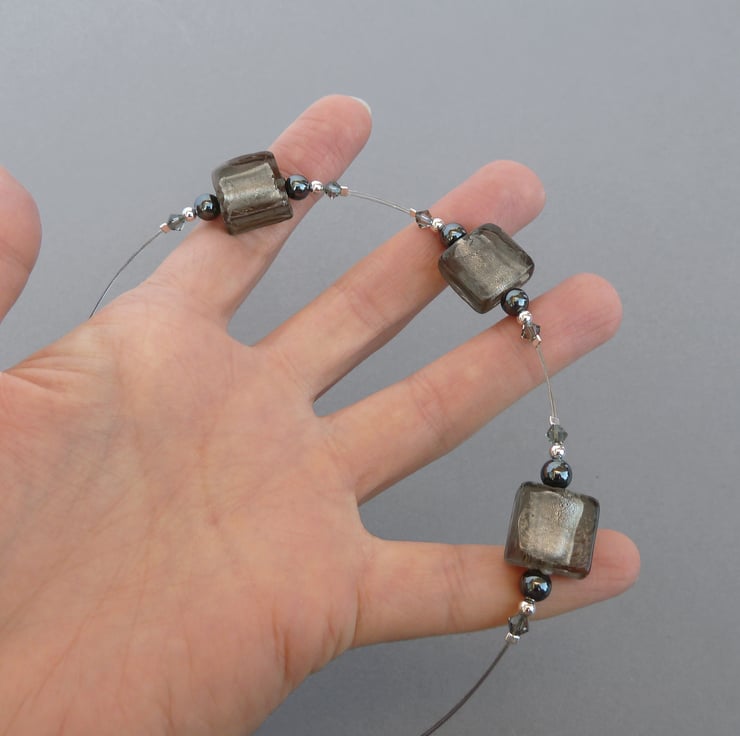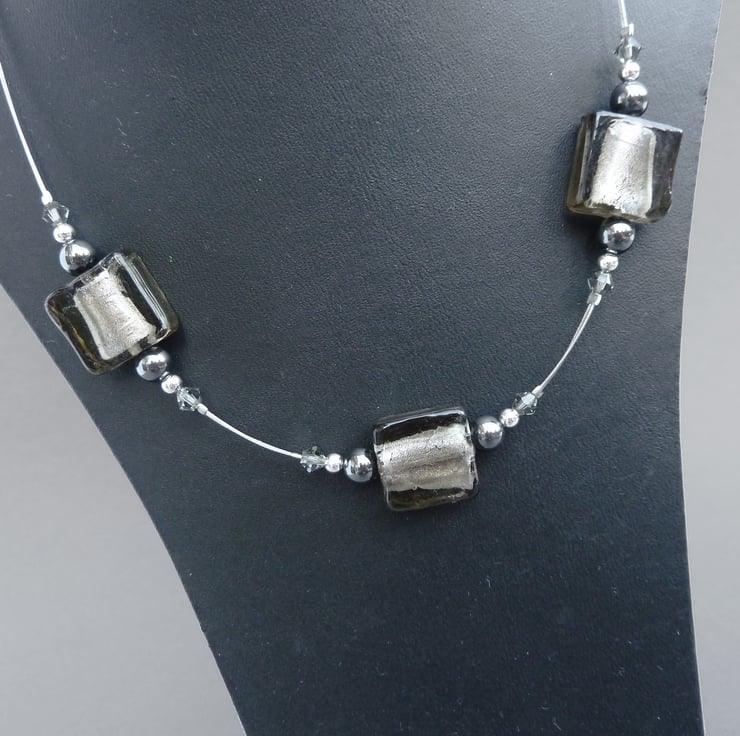 The square focal beads used to create this grey fused glass necklace are made by fusing silver foil between layers of coloured glass. The foil gives the beads a metallic sheen. The focal beads measure 1.5cm x 1.5cm and are partnered with hematite, silver plated beads and Swarovski crystals.