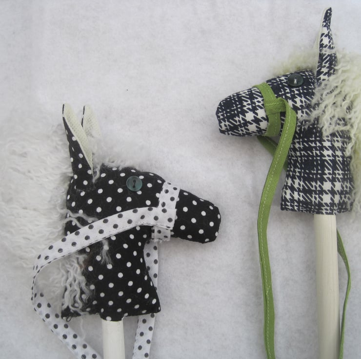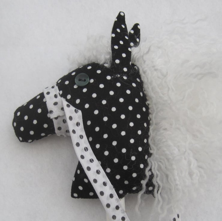 Hand sewn fabric head, with woollen mane, button eyes and wooden stick.