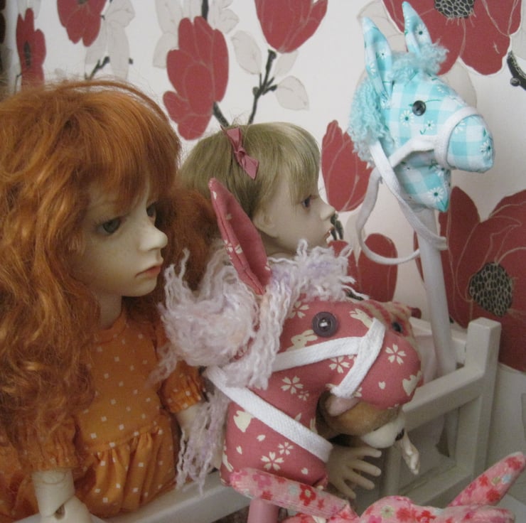 We started making these mini hobby horses for friends with ball jointed dolls (BJDs), and making them got rather addictive, so we now have a stable full of them looking for new homes!