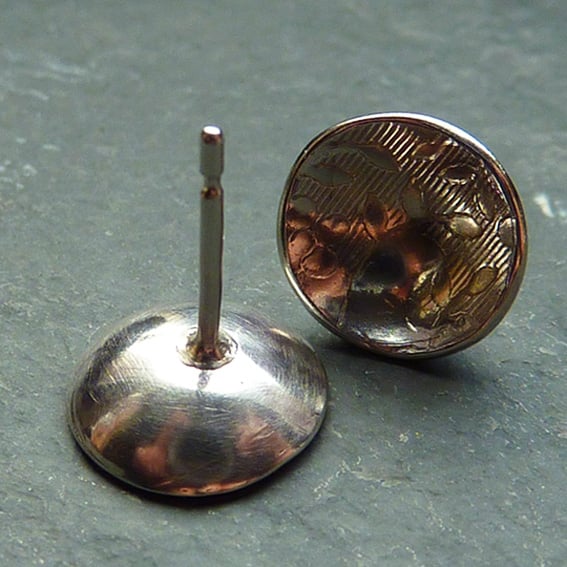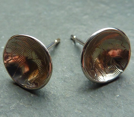 Simple and understated, these stylish earrings are created from lovely floral patterned thick silver sheet which has been shaped into a concaved dome.