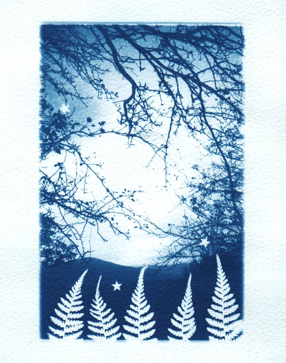Created using ferns, stars, mountain negative, watercolour paper, a light sensitive solution and the sunshine!