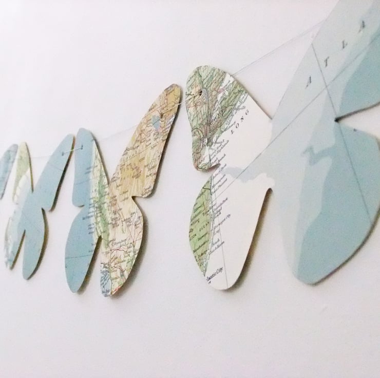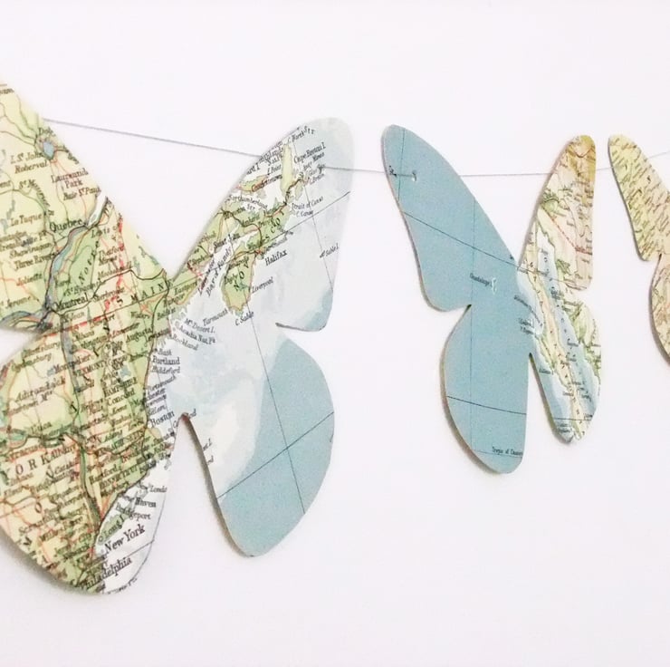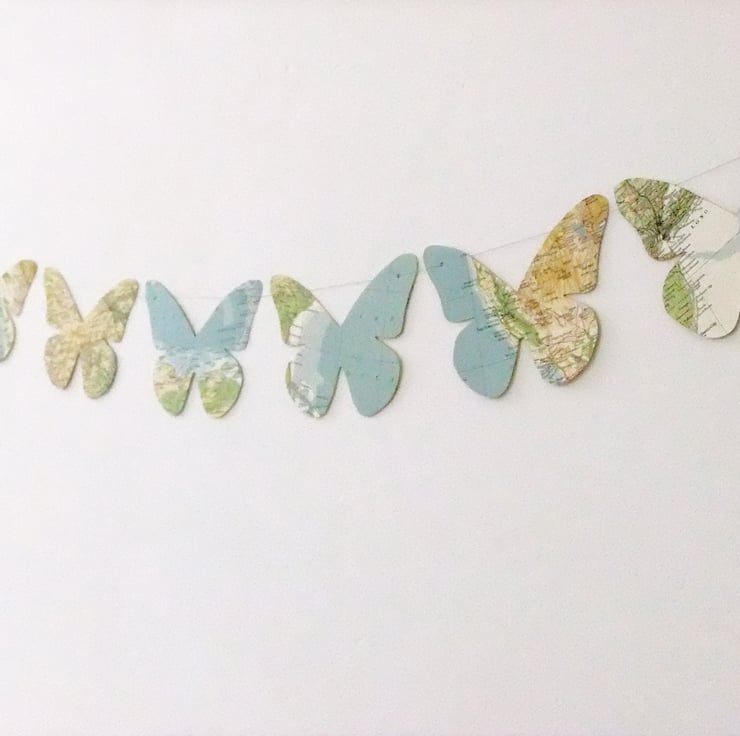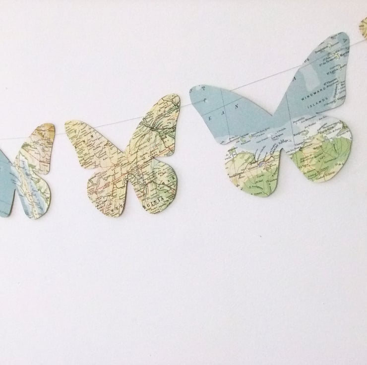 This lovely butterfly bunting has been upcycled from a vintage World Atlas, published in 1961. I have hand cut 7 beautiful paper butterflies to wing their way into your home on this lovely garland of bunting.