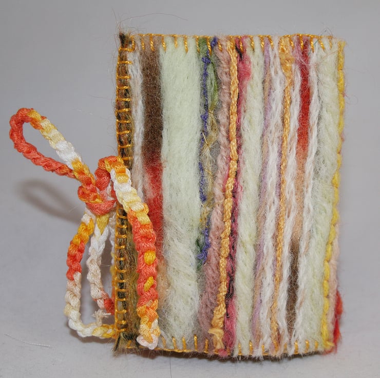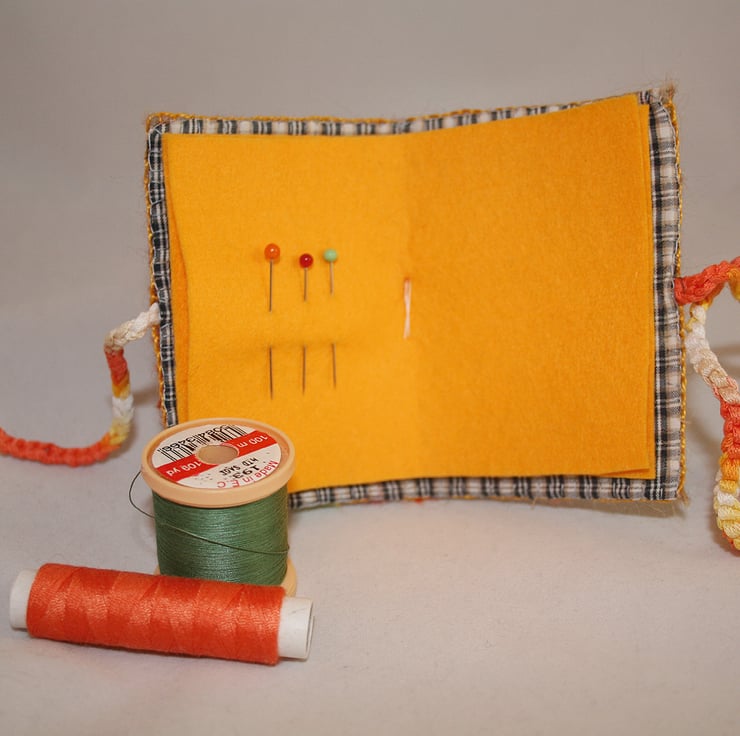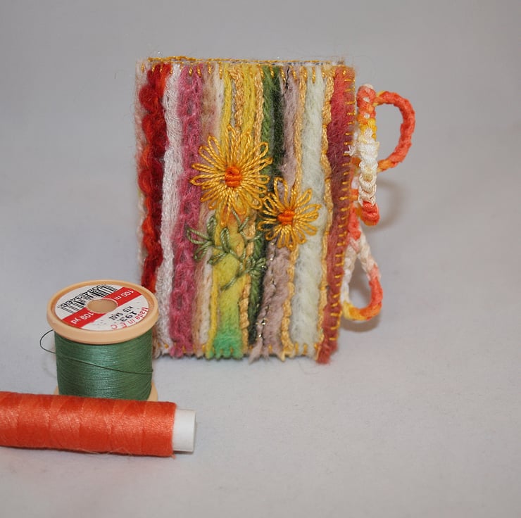 A variety of yarns in greens, golds and scarlets are felted to a kunin felt background, using an embellisher machine. Daisies are embroidered in crochet cotton onto the front of the cover. The same crochet cotton is used to edge the cover in blanket stitch. The cover is reinforced with a layer of interfacing and lined with green checked fabric from an up-cycled shirt. The needle case closes by tying a bow in crocheted cords worked in yellow, orange and cream cotton knitting ribbon. Two pieces of golden yellow felt are stitched into the center, forming four 'pages' for your pins and needles.