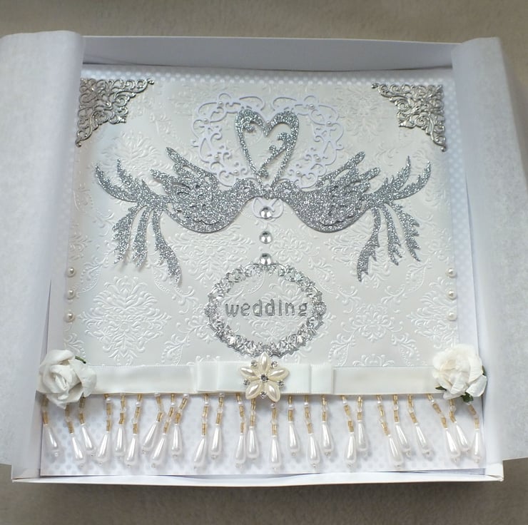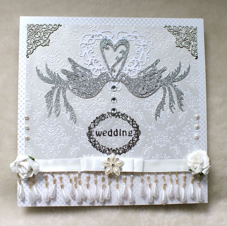 A luxury handmade wedding card for a special couple, this exquisite card is large at 8"x8" square. It is adorned with embellishments: attractive crystal decoration on a Dior style white bow with faux pearl trim, and mulberry paper roses, with a pair of elegant silver glitter partridges embracing a heart, with metal filagree corners on pearl boudoir paper and metallic pearl polka dot embossed card. Includes 'Congratulations' sentiment inside. Supplied in a white presentation box with tissue paper, posted in a jiffy bag, as a small packet.