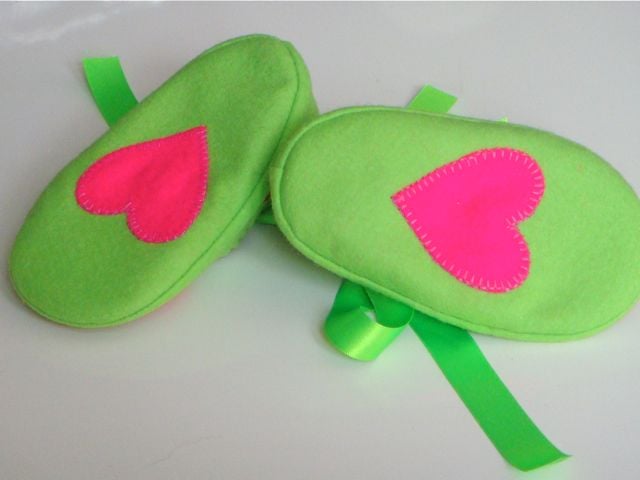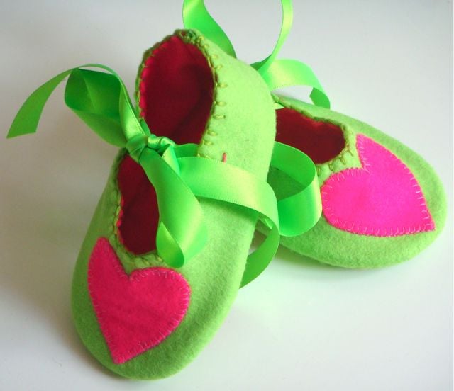 These are so sweet, they have lime green felt uppers and soles, they are lined in neon pink felt, they are decorated with 1 neon pink heart on each toe, and a neon pink heart on each sole, with lime green ribbon ties, the pattern for these shoes are for 3-6 mths, but they may fit an older baby, 11cm length and 5.5cm wide, inside measurements.