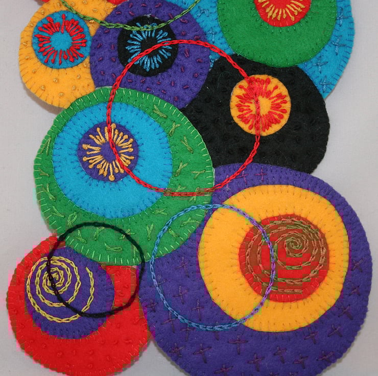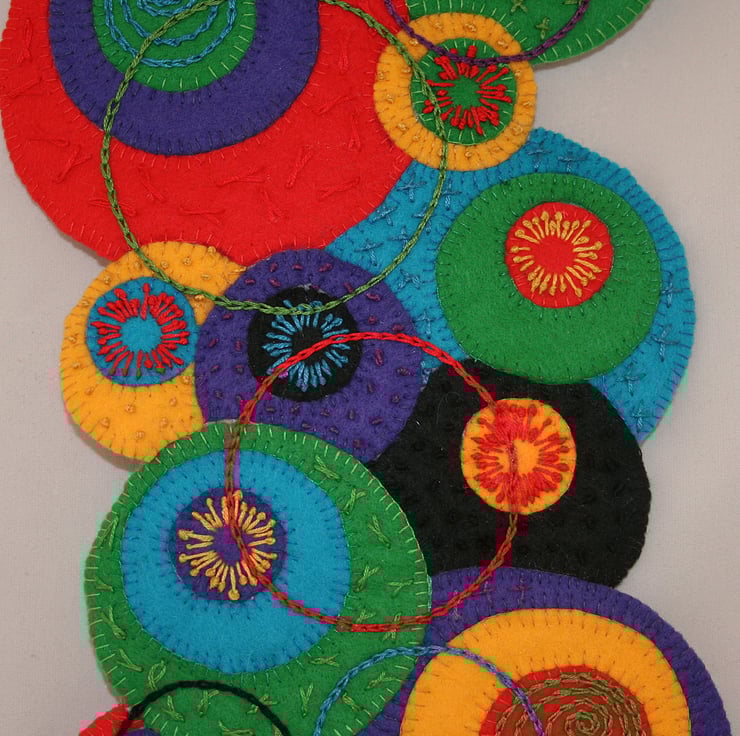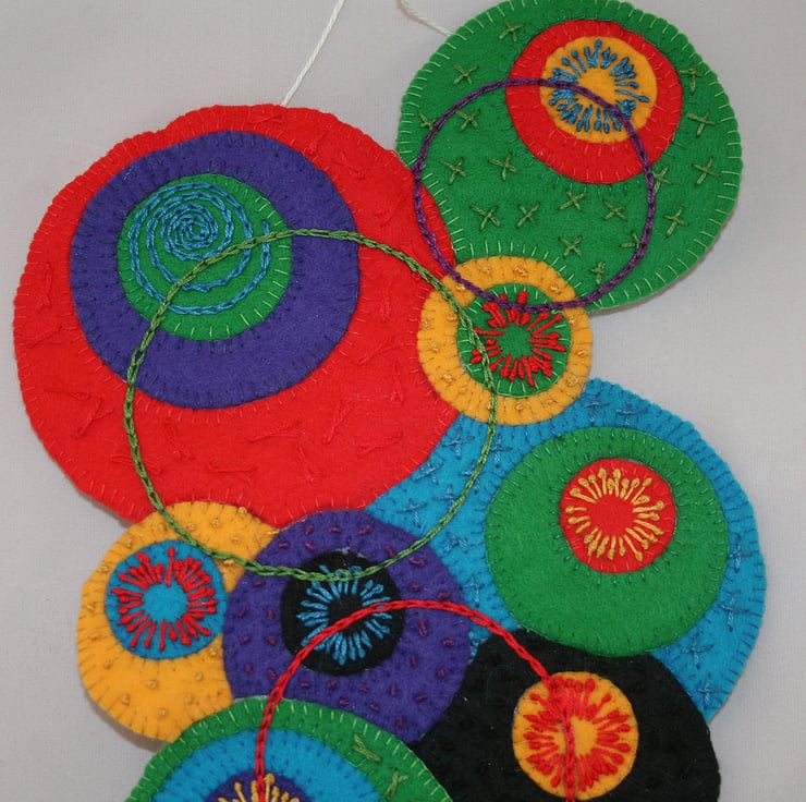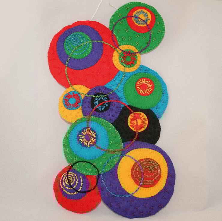 Composed of brightly coloured felt circles, overlapping each other, edged in blanket stitch and embellished with hand embroidery - bright and modern - it looked lovely hanging to be photographed in our conservatory!