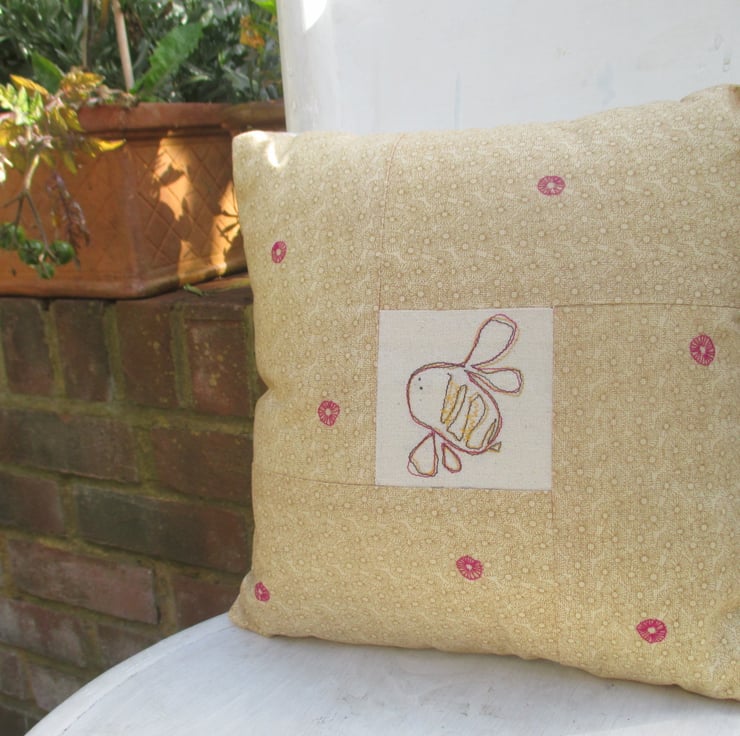 This pretty, floral cushion is 30cm square and is a perfect summer accessory, with a traditional cottage feel. I used a piece of pretty, cotton fabric, printed with a sunflower design and added some hot pink highlights and a cheeky, embroidered bee motif in the centre.