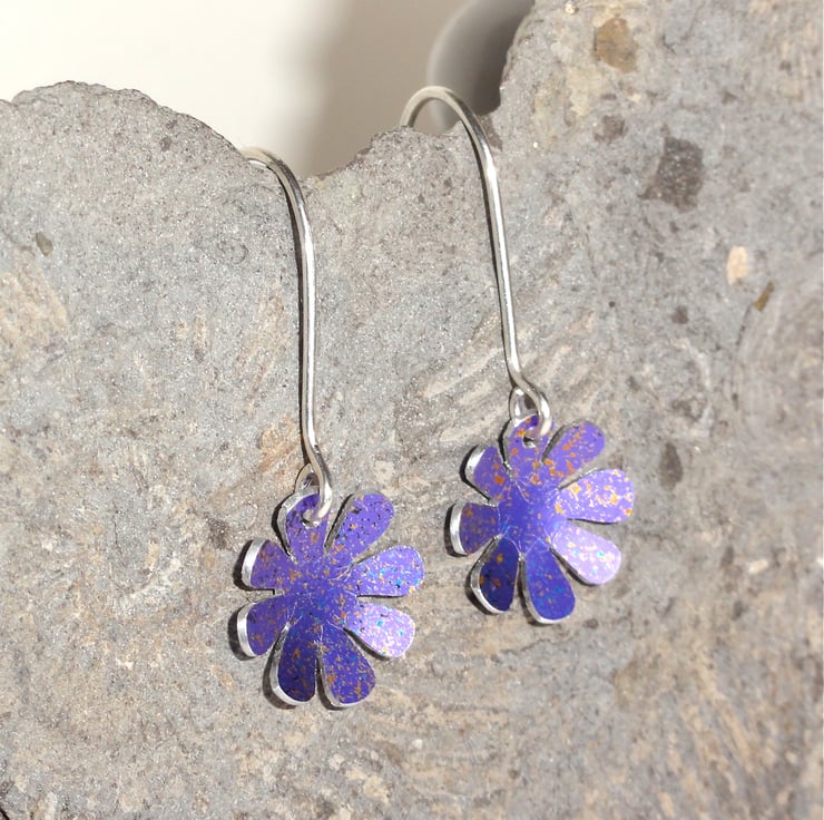 Lovely hand painted, hand cut domed aluminium flowers hung from hand made sterling silver ear wires. Please note I make this item to order.