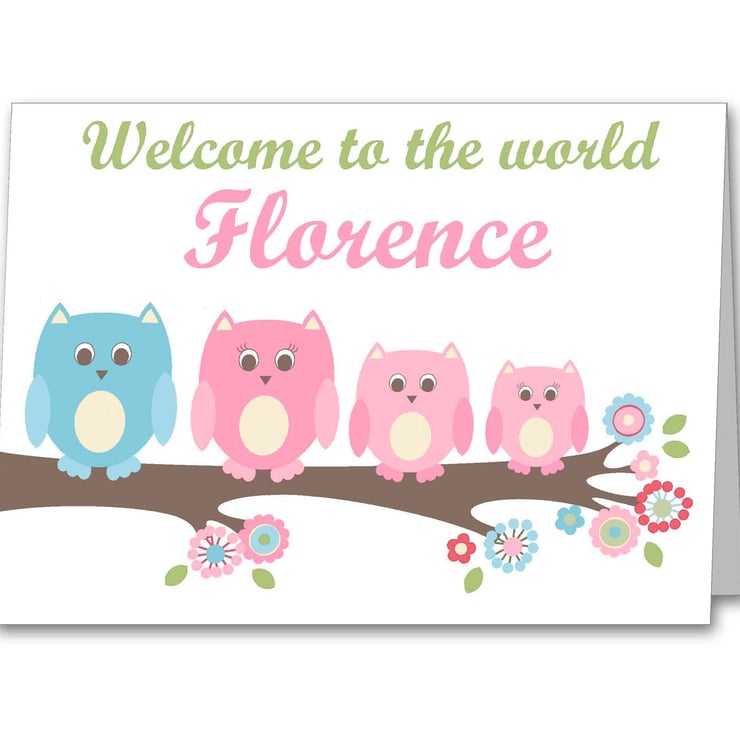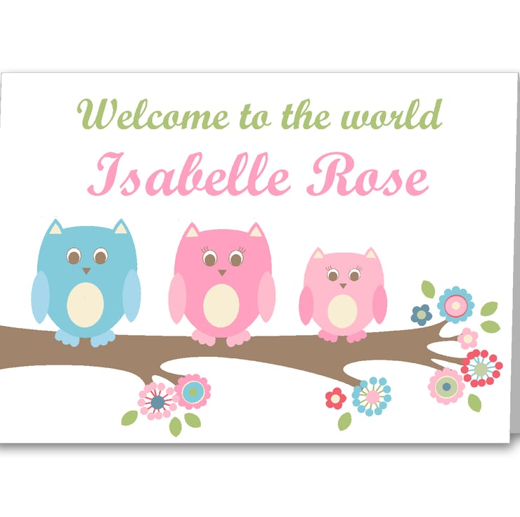 This new baby card features a little owl family sitting on a branch. It has a lovely personal touch because I design the little owls to fit in with the family you are sending it to, making it a really thoughtful card that the baby girl's family will love.