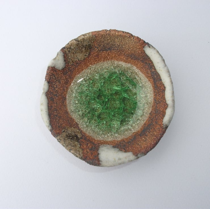 When I first discovered melted glass in ceramics I loved the contrast of the rough matt fired clay and feminine aura of the glass. I wanted to combine the two in a mature way to make a piece of peaceful beauty. They remind me of rock pools at the beach, pools of spring water, - life.