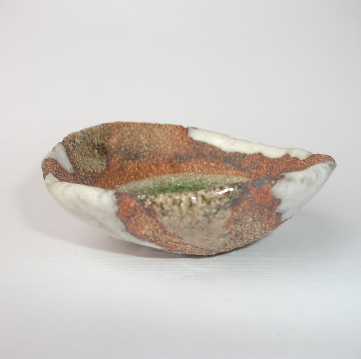 A handmade stoneware ceramic bowl with a gentle green pool of melted glass in the centre.