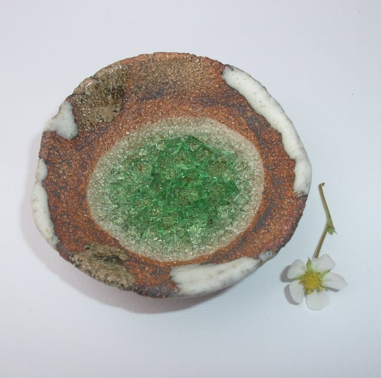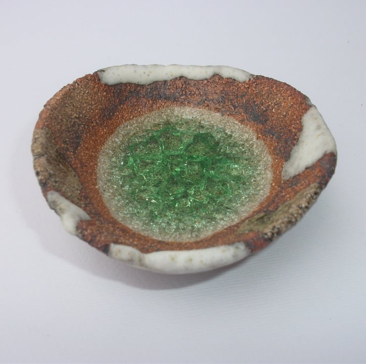 I hand built this bowl, textured it and then added the detail before bisque firing. I then washed it with an oxide and painted in the detail. Two glazes were applied to give the bowl extra depth. I then fired it a second time to 1220C with recycled glass in the base which melts and pools.