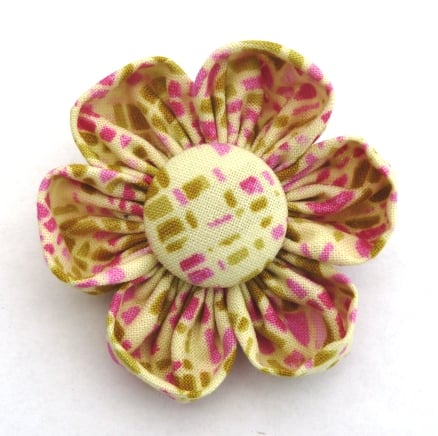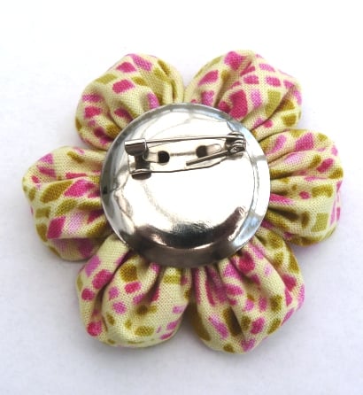 This lovely Corsage Brooch is Handmade from a Green and Pink printed fabric with a cover button in the centre made from the same fabric. On the back is brooch pin. This will compliment any summery outfit.