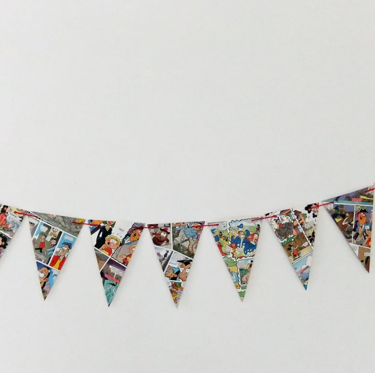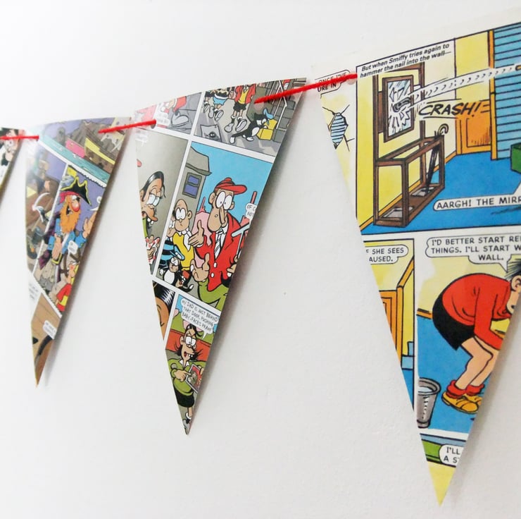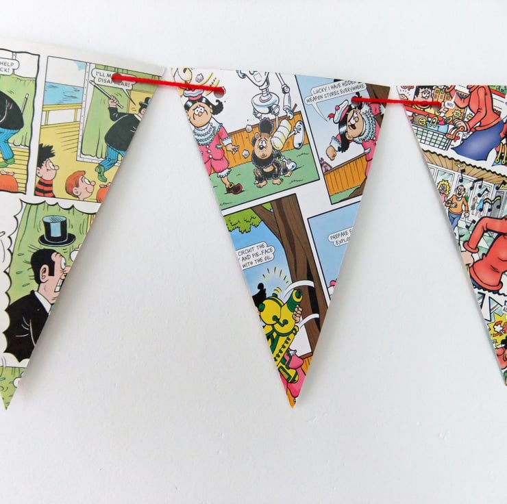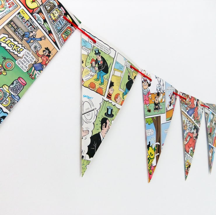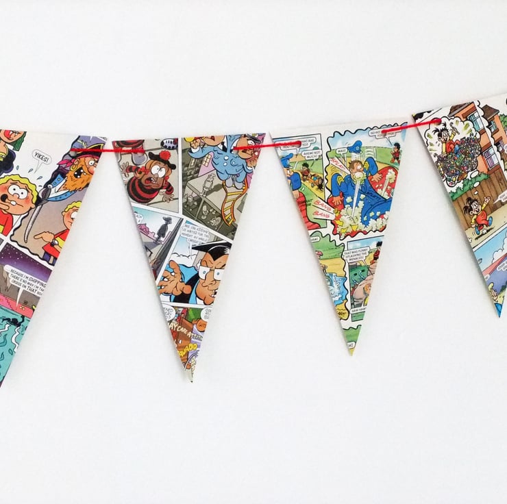 This great paper bunting has been upcycled from a discarded copy of the Beano Annual. This listing is for ONE bunting with 14 triangular flags, each 10.5 cm across and 17 cm long. The garland is threaded with rescued red yarn.