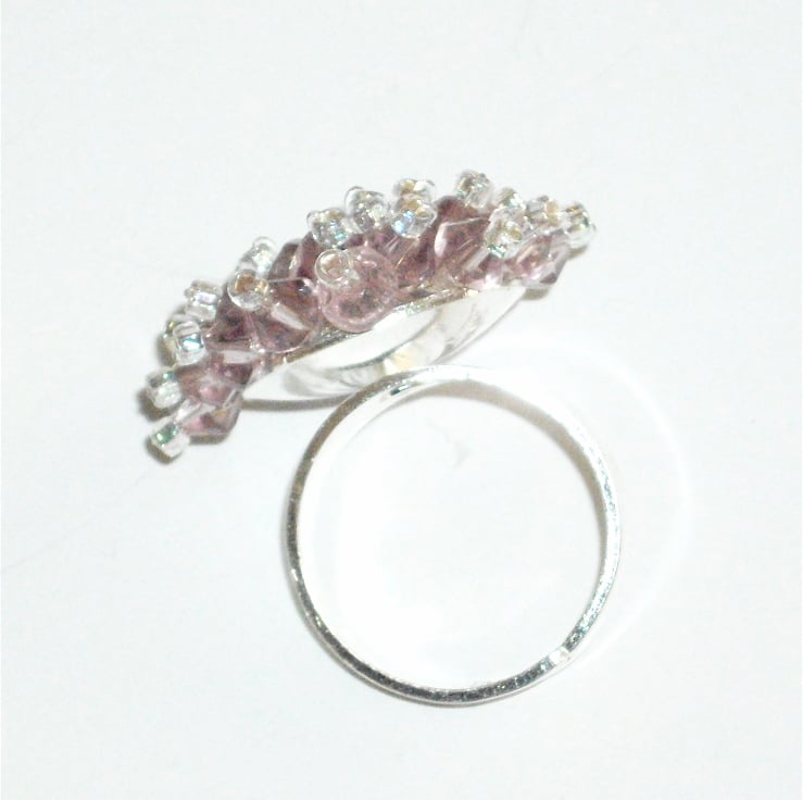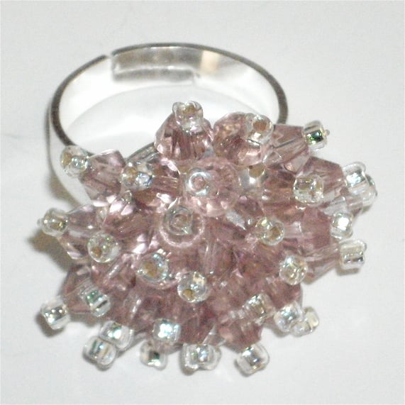 This ring is hand made from 4 mm bicone crystal beads which are individually strung onto a silver plated ring which is adjustable to fit most ring sizes.