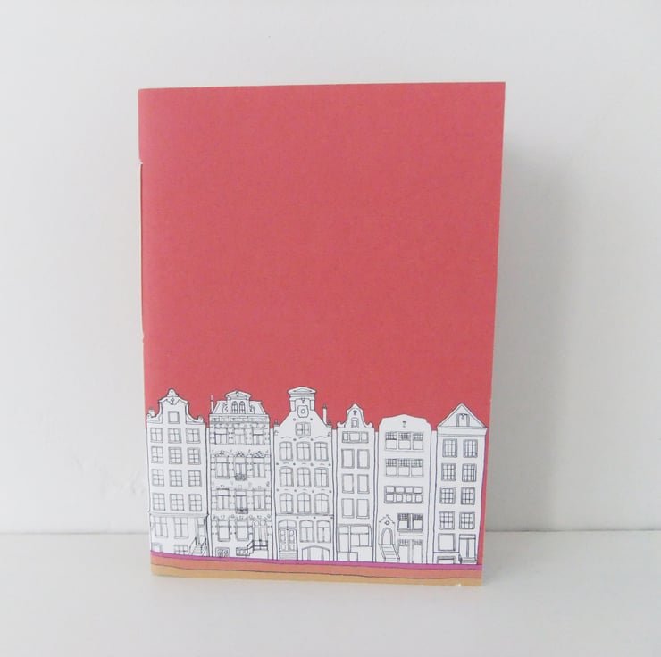 This listing is for a small coral Amsterdam notebook with a fabulous line drawing of the canal houses in Amsterdam, the Netherlands. The drawing wraps around from the front onto the back of the journal.