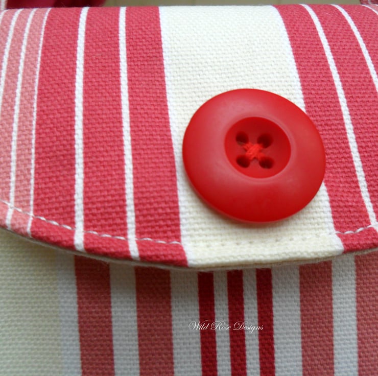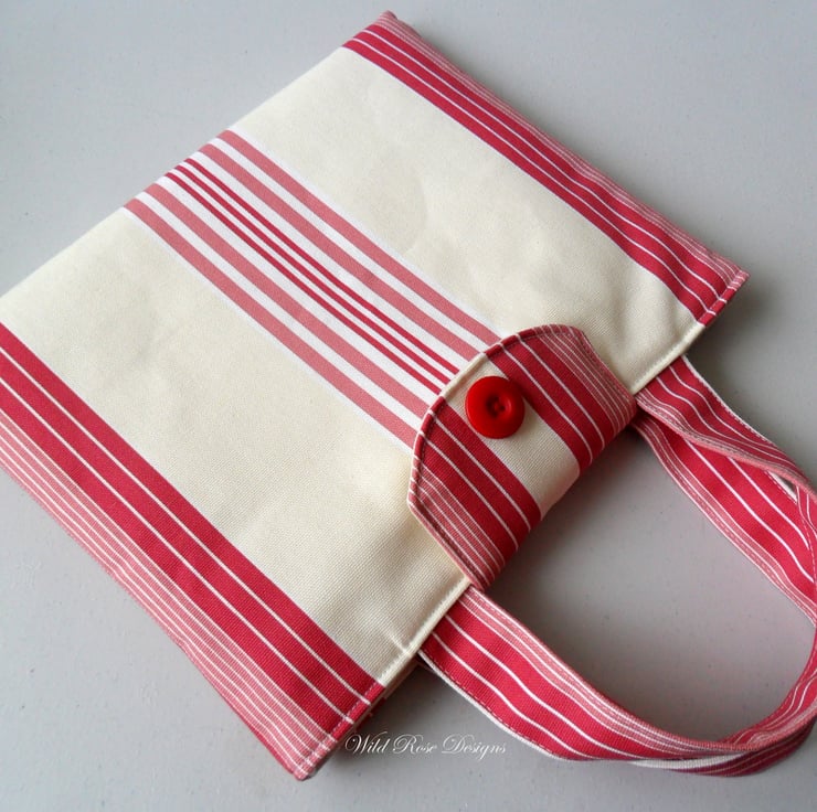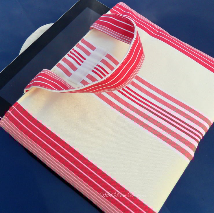 A very smart iPad sleeve made in 'LuLu Stripe' cotton fabric by Clarke and Clarke. The sleeve is lined in a natural calico and and is padded to protect your iPad. This sleeve also has two handles to make it easier to carry, and there is a Velcro fastening flap with toning button to ensure that your tablet stays put!