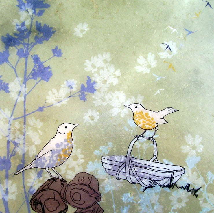 'Song thrushes and gardening trug'