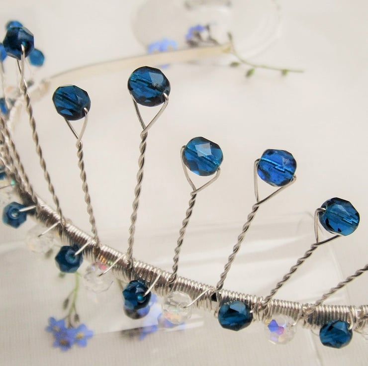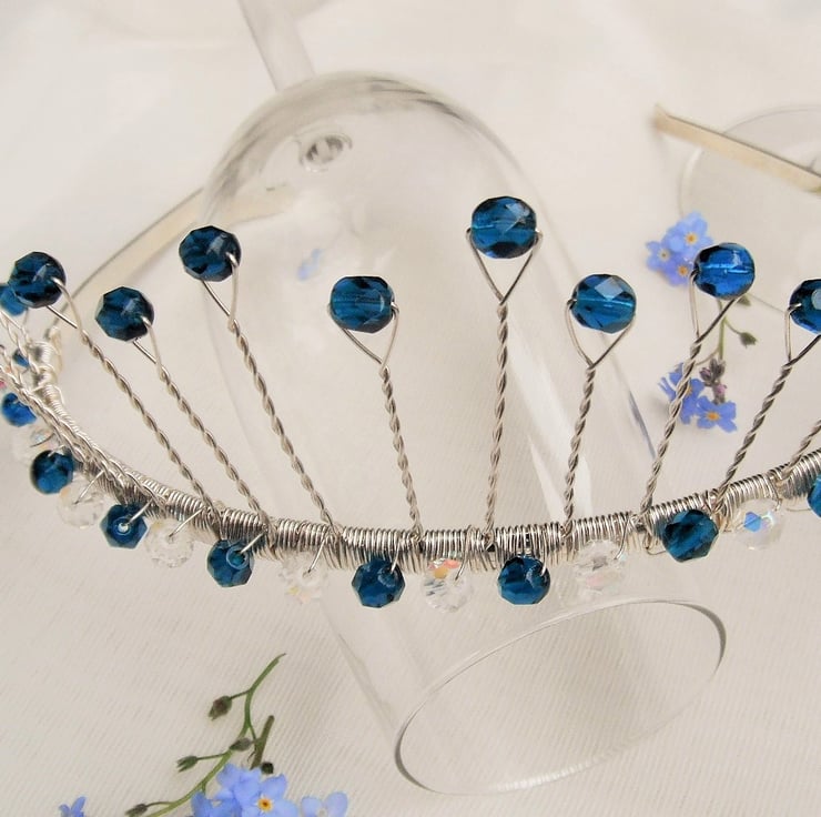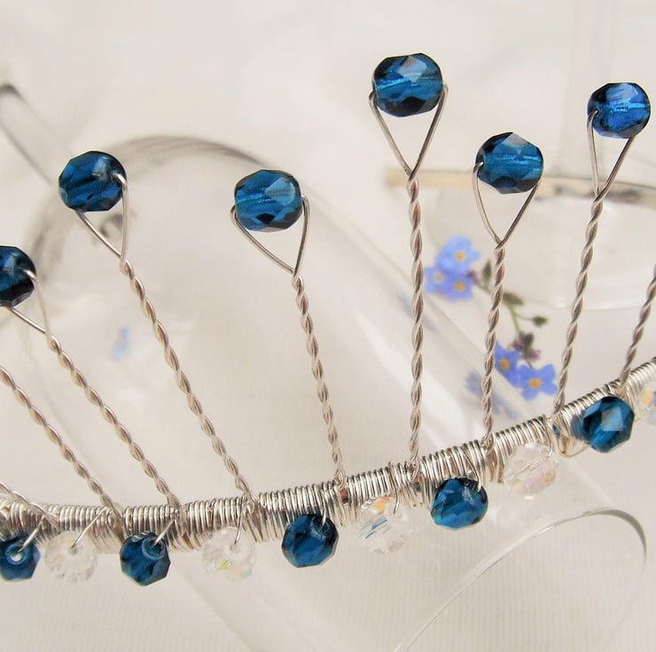 Diana Tiara - Crystal clear AB, and dark turquoise blue Czech glass faceted crystals, on a silver plated half 'D' band with silver plated wire.