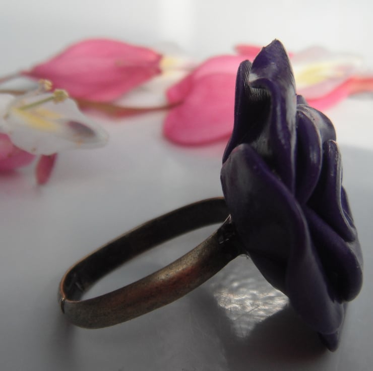 This is a hand crafted polymer clay rose, made from purple fimo, which is attached to an antique gold adjustable metal band.