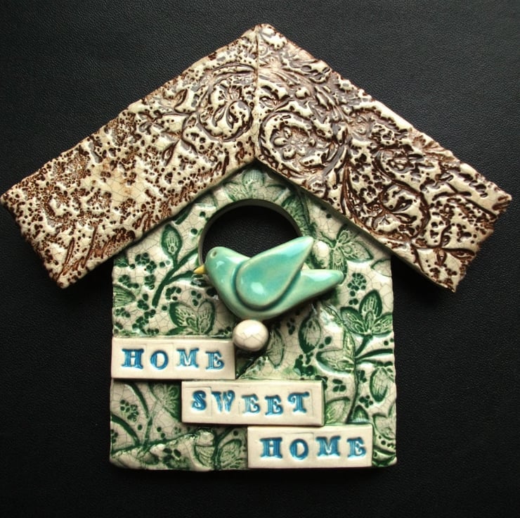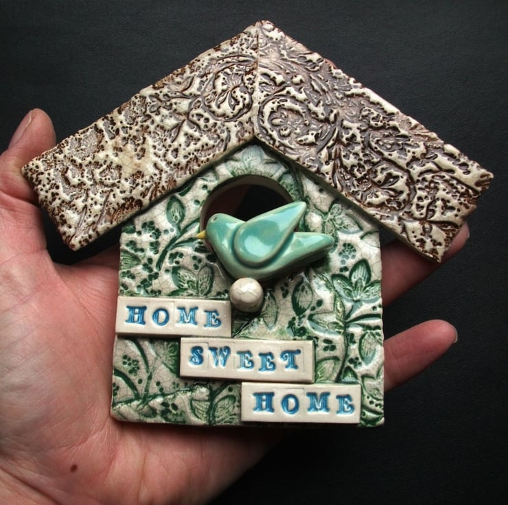 This sweet little decorative birdhouse ornament is made from white earthenware clay, embossed with pattern and finished in a crackle glaze.
