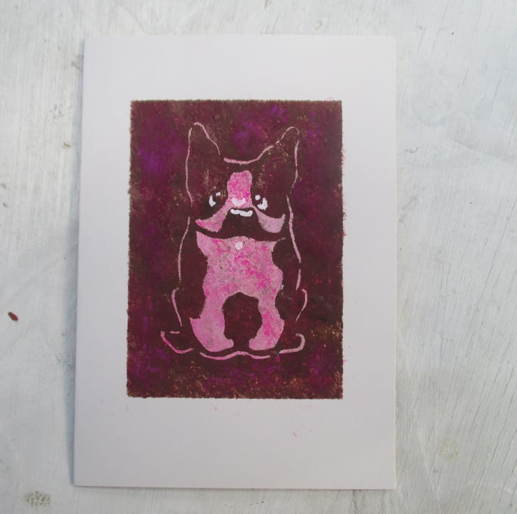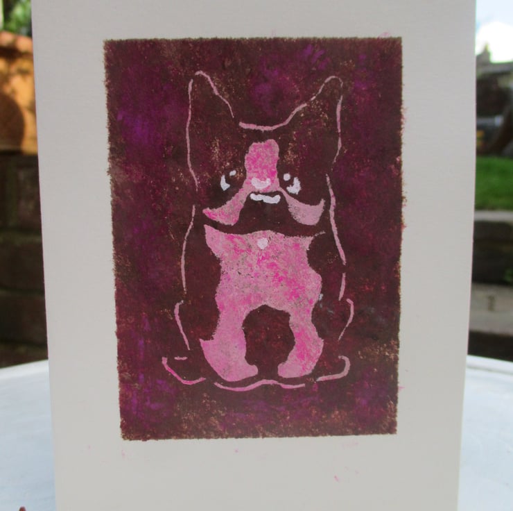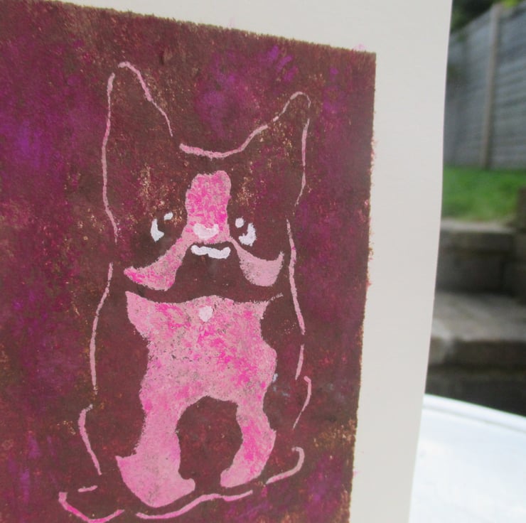 New, cute French Bulldog design is called "Frenchie Rose". This is an original design created for fun! This characterful girl is hand painted using stencilling. My cards are all handmade using recycled card and envelopes. Each one is A6, blank for your own message and presented with an ice white envelope in biodegradable clear sleeve.