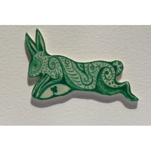 A fanciful green rabbit leaping over a teeny shamrock. Measuring 4cm from the tip of his nose to the tuft of his tail. He was doodled onto shrink plastic in green pencil and backed with a brooch fitting. Presented in a small handprinted manila envelope.