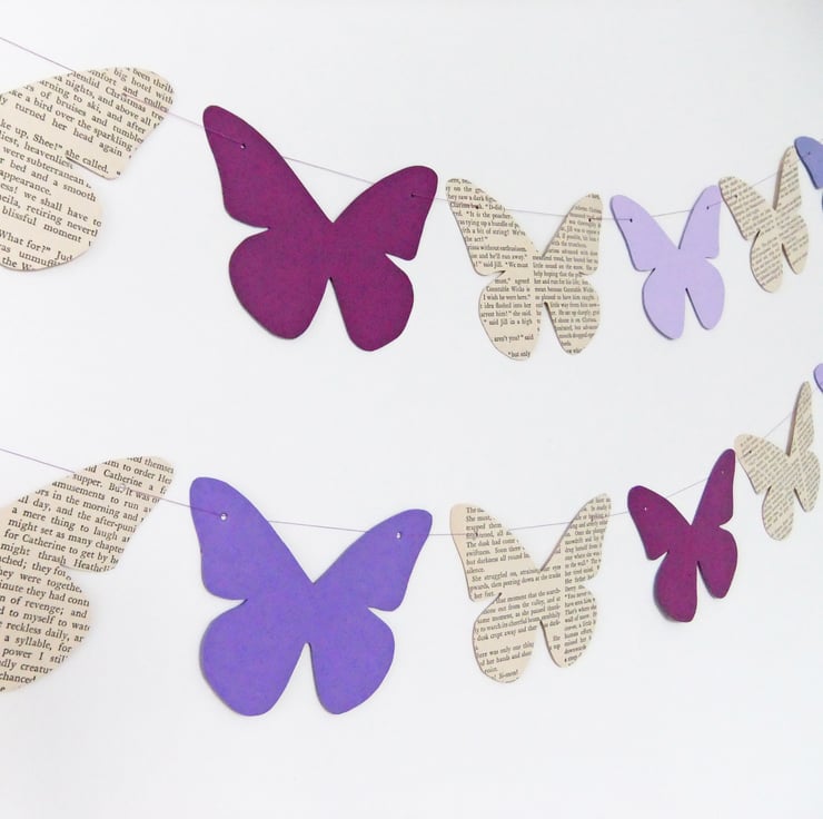 This listing is for ONE garland of bunting with 7 hand-cut butterflies. The butterflies measure 14 cm at their widest point so if they were laid end to end on the yarn they would stretch 98 cm (approximately 3 feet 2 in). I have threaded the butterflies onto beading thread or yarn with extra so that you can space the butterflies out if you wish. Your butterflies may be very slightly different from those in the photos but will be equally lovely!