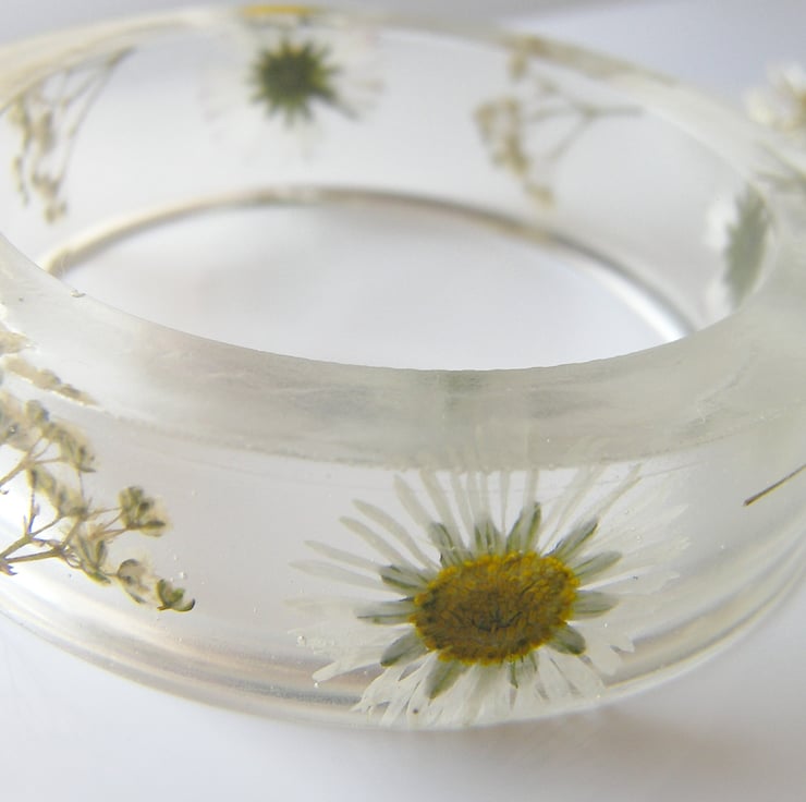 Description: I very carefully pressed these daisies picked from my very own garden:) Dried and treated to retain color before carefully layering and sealing in uv resistant non toxic resin along with this very pretty white gypsophila (babies breath) again carefully dried and treated . The bangle fits a small size wrist and measures approx: 2 3/8 Inch inner diameter, 3/4 Inch height, 8mm thickness.