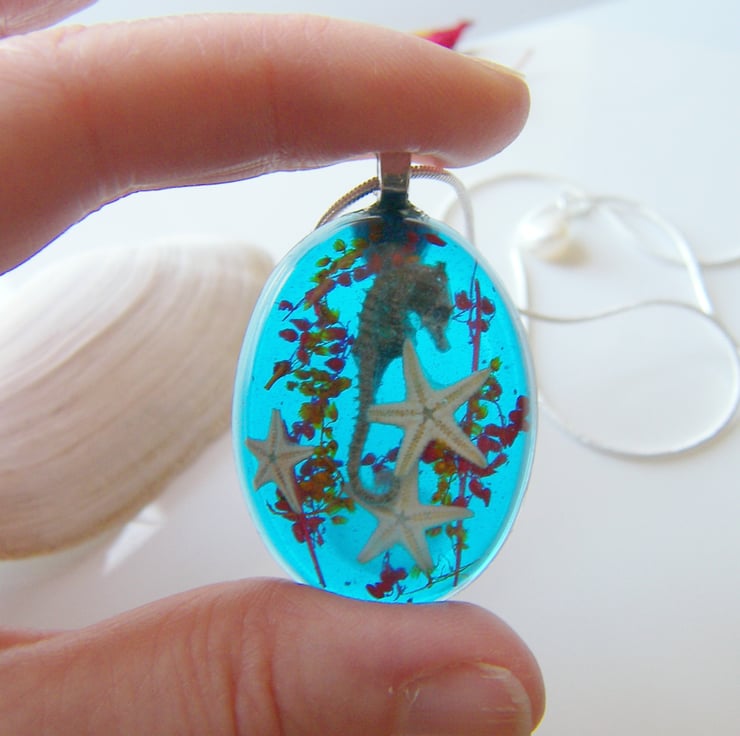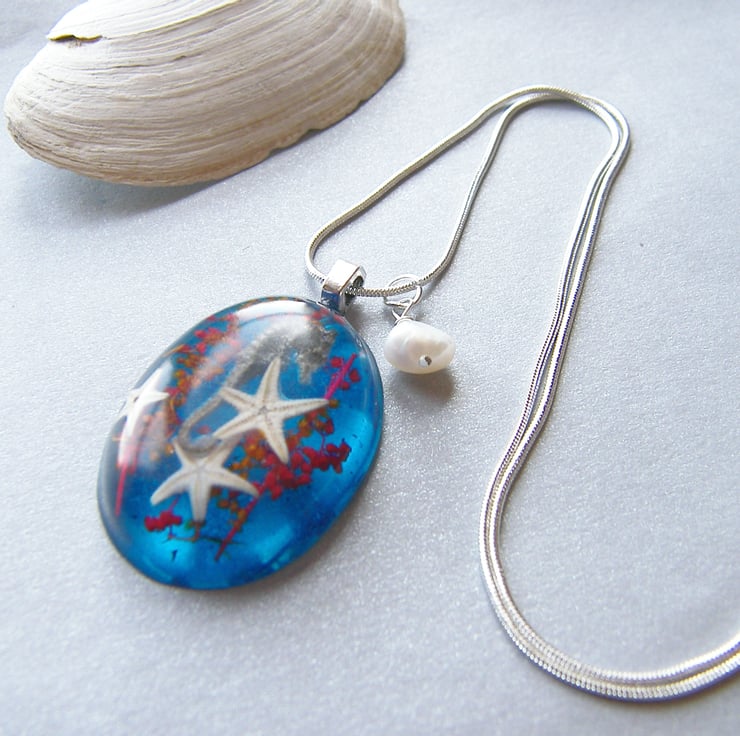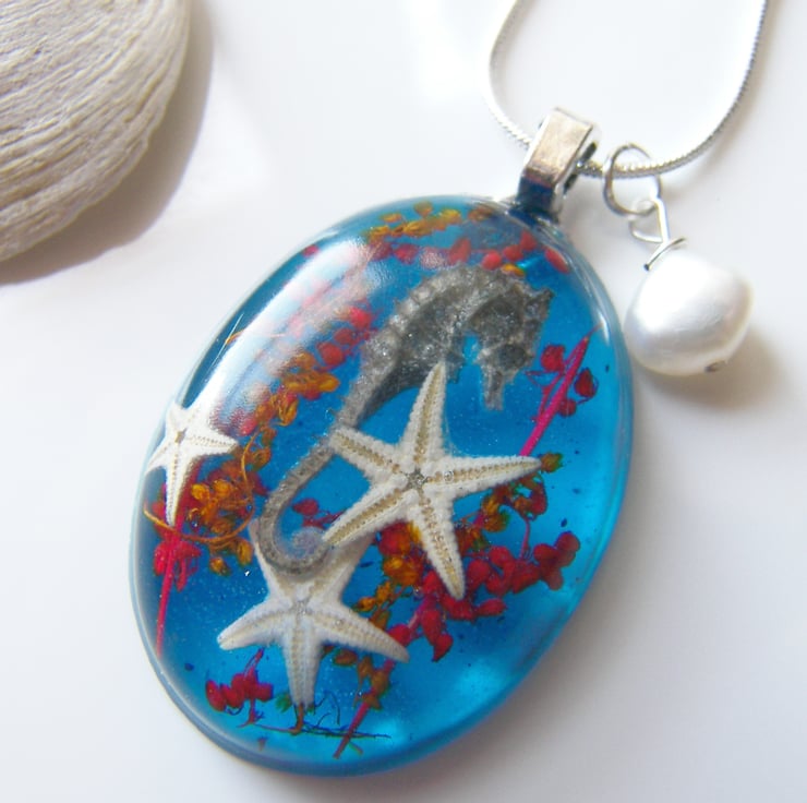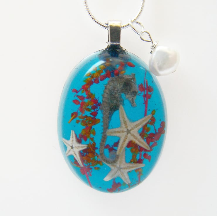 Description: I have added this pretty real seahorse and real starfish ( I have been advised that the seahorse and starfish had naturally expired) to some pretty blue UV resistant, non toxic resin. Carefully added some delicate orange and red real flowers to create a look of sea coral to this lovely underwater garden:) Pendant measures approx 40mm x 30mm, (approx 1.5" x just over 1") hangs on a pretty 18" sterling silver plated chain with 925 stamp.. and real freshwater ivory pearl attached. This necklace is perfect for any nature / nautical seaside lover:)