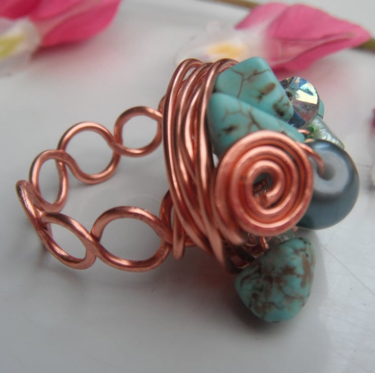 This wonderful ring is hand crafted from 1mm copper wire, on a band wrapped in a style that gives it a Celtic feel.