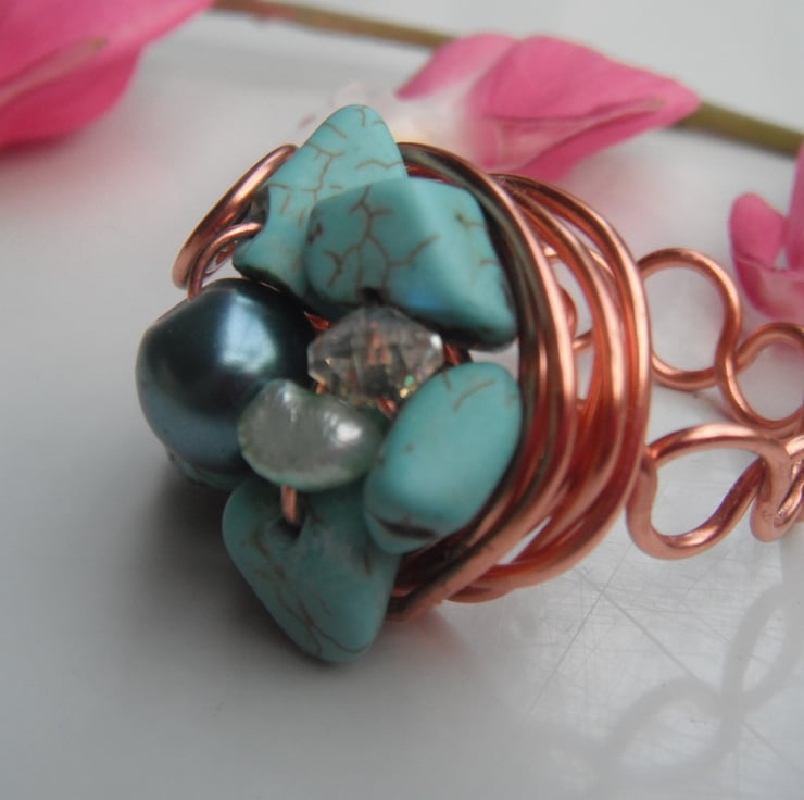In it's swirly nest, sits a cluster made of a combination of semi precious turquoise chips, Czech glass crystal and pearl, and pastel green potato pearls. The flecks of copper vein through the turquoise chips, mean that they lend themselves very nicely to being wrapped with copper.