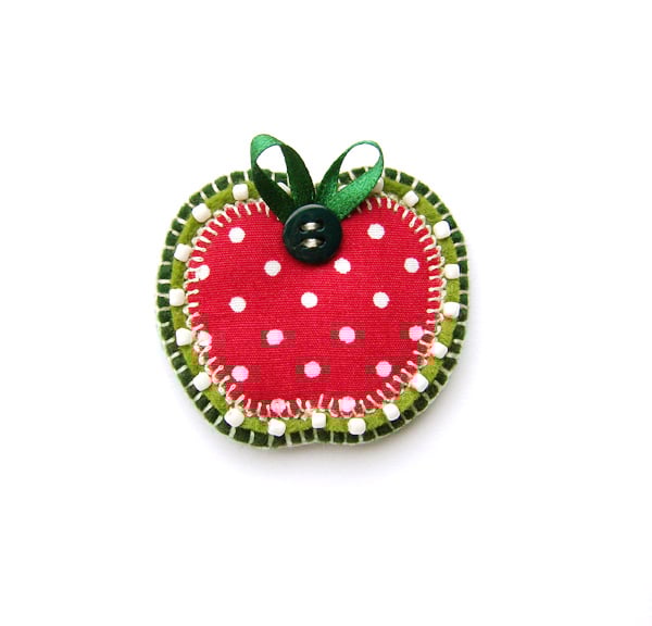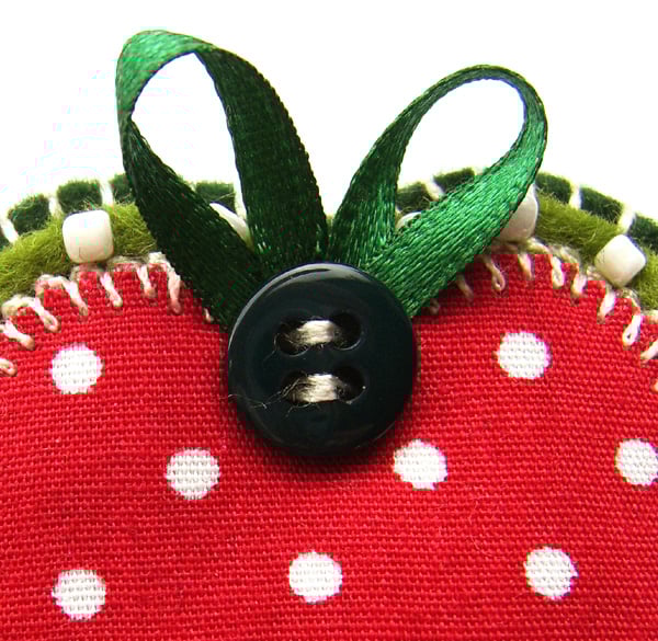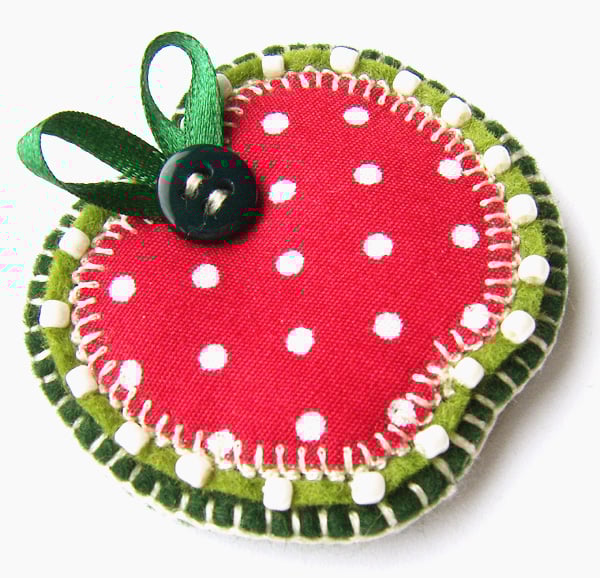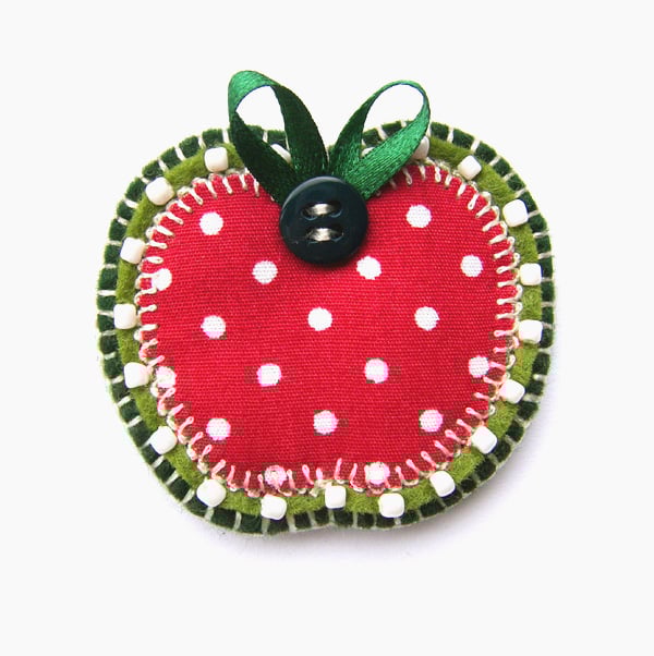 It features an applique apple in pretty red polka dot fabric, it is mounted onto an olive green felt base which is edged with cream seed beads. It is further mounted onto a dark green felt backing and is finished with a little button and ribbon detail. There is a metal brooch pin on the reverse side for easy attachment.