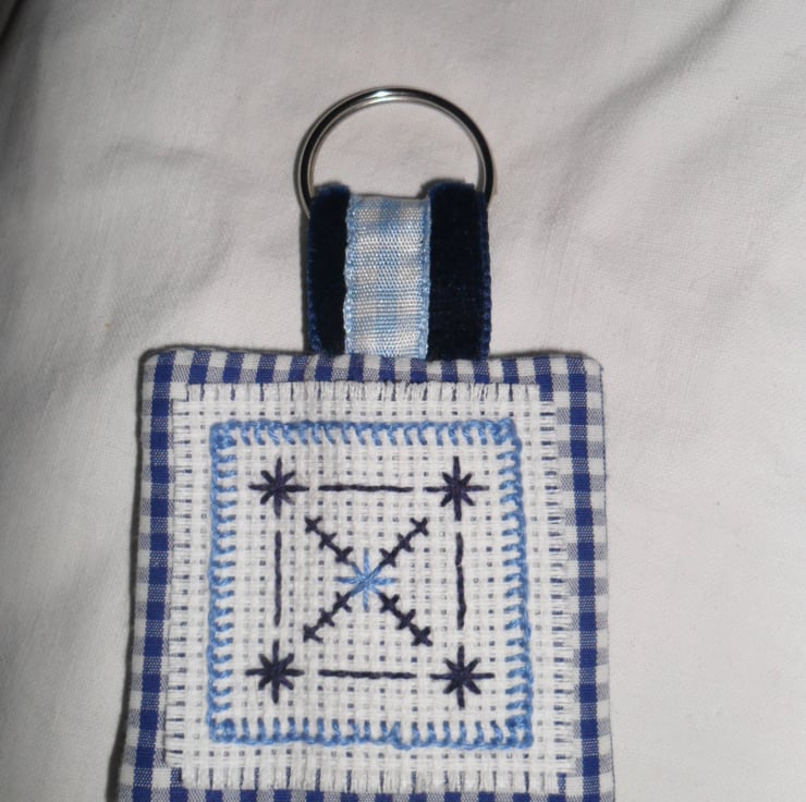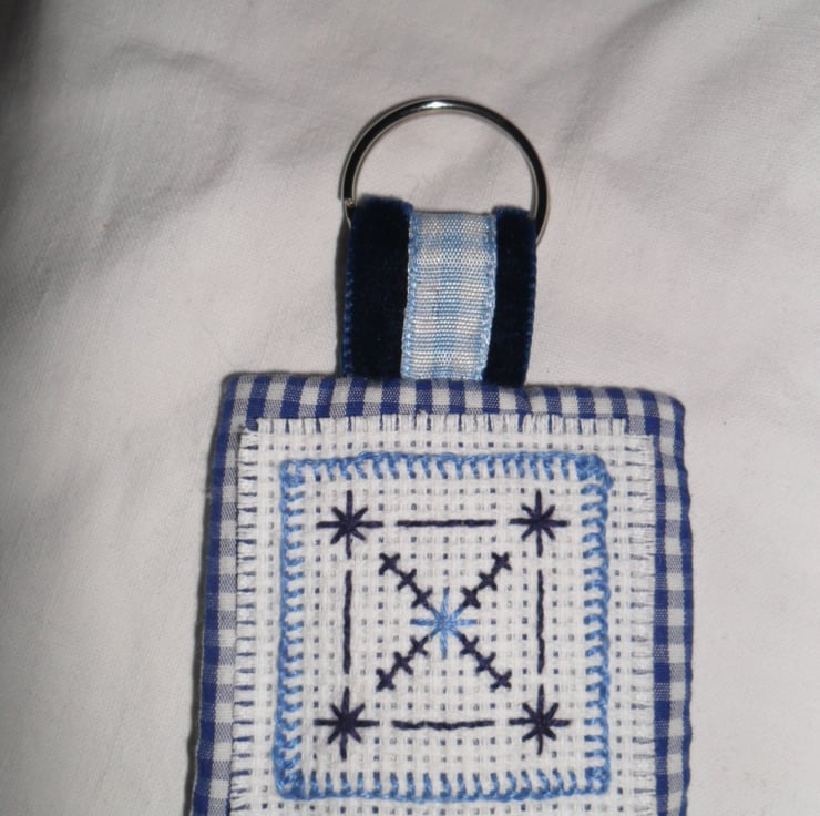 This square key ring is one of my favourite designs I have devised of late. I have used two different shades of blue Anchor threads and combined it with some small blue and white checked material. I have used a blue velvet ribbon along with a light blue and white thinner ribbon to make the loop to contain a 25mm split ring. The design is repeated on the revise side.