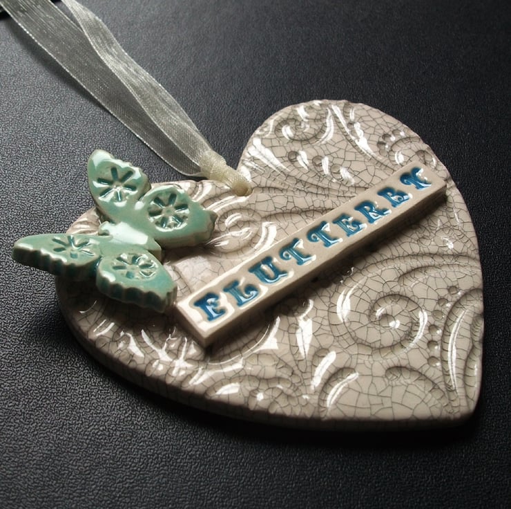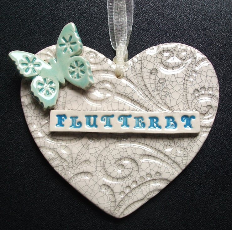 This ceramic heart is made from white earthenware clay and decorated with a blue coloured butterfly and finished with the word Flutterby.