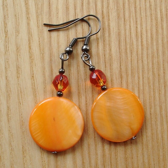 These funky earrings feature lovely vivid orange shell disc beads. They are hung off black plated pins and black plated earwires with facetted orange glass and teeny spacer beads. Really cute and fun to wear.