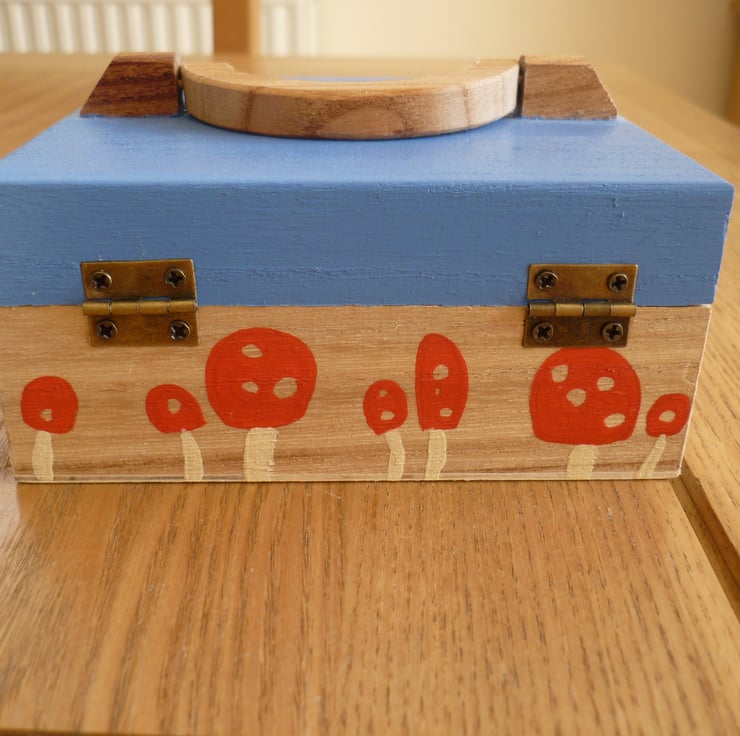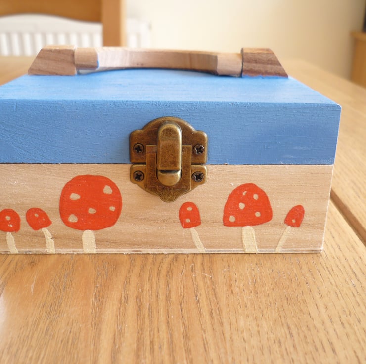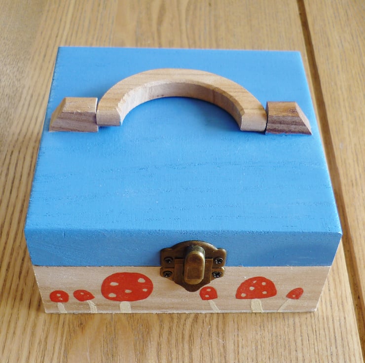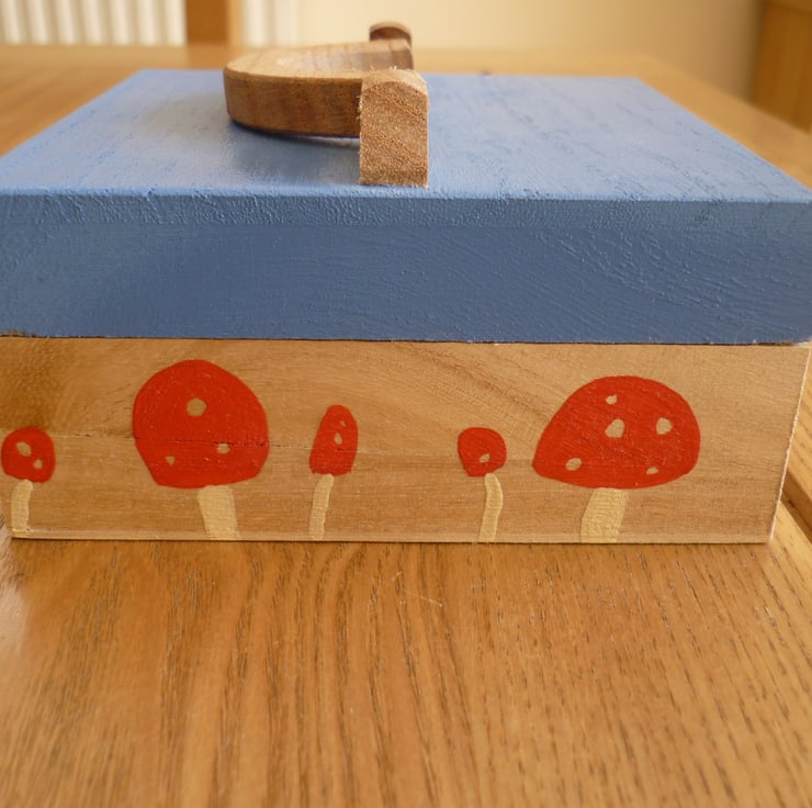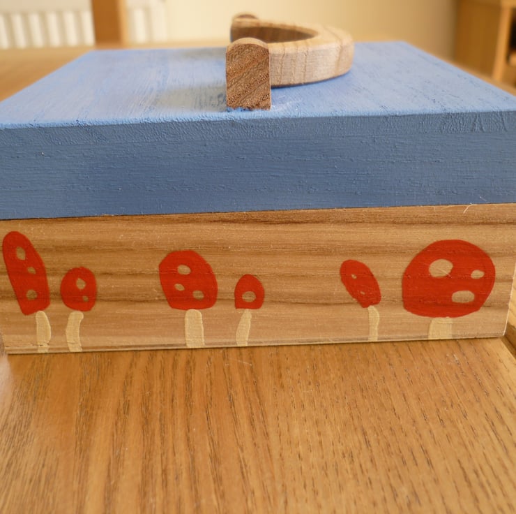 This adorable hand painted box measures 12cm x 12cm x 5.5cm . It has been coated with 3 layers of varnish to make it hard wearing.