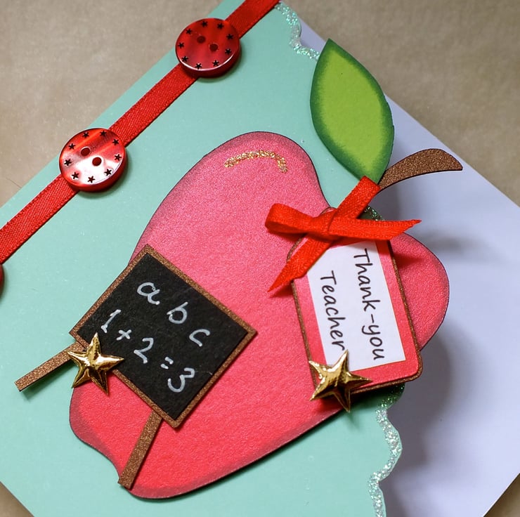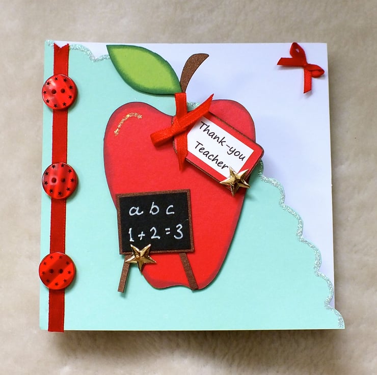 Decorative handmade, Thank You Teacher card, size approx. 5"x5", embellished with an apple and buttons for a very special teacher. Blank inside for your own message. Supplied with a white envelope and protective cellophane bag, posted in a sturdy cardboard box, large letter size, to protect the card embellishments.