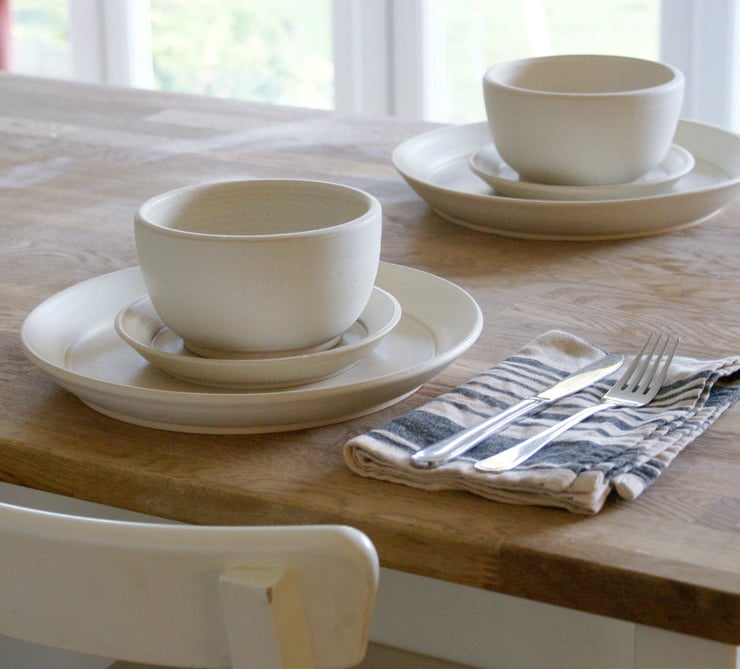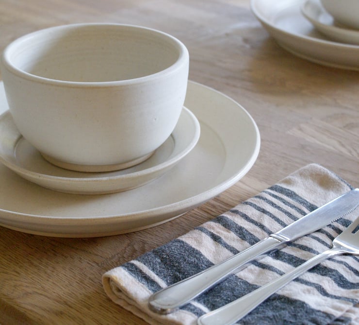 Every plate features a large flat eating surface and a gently bevelled rim, each one is unique and can be made with or without textural throwing rings. The small soup bowls to accompany the set have an elegantly curving Japanese look leading up to high straight sides and a rounded off rim.