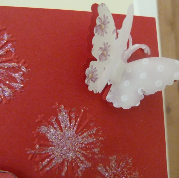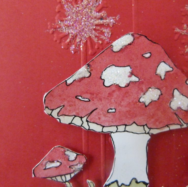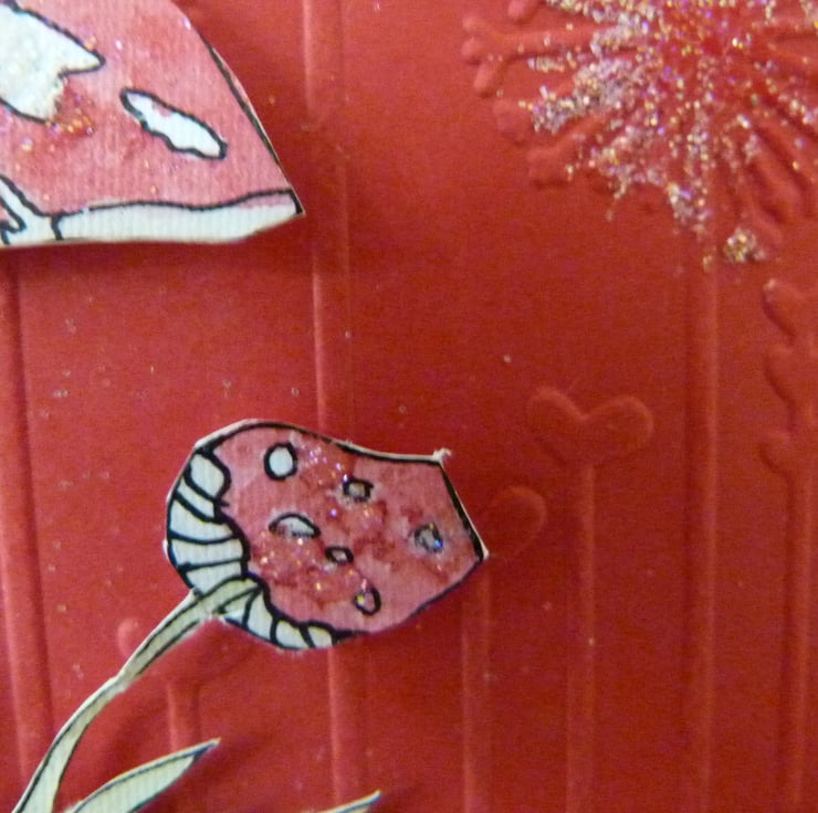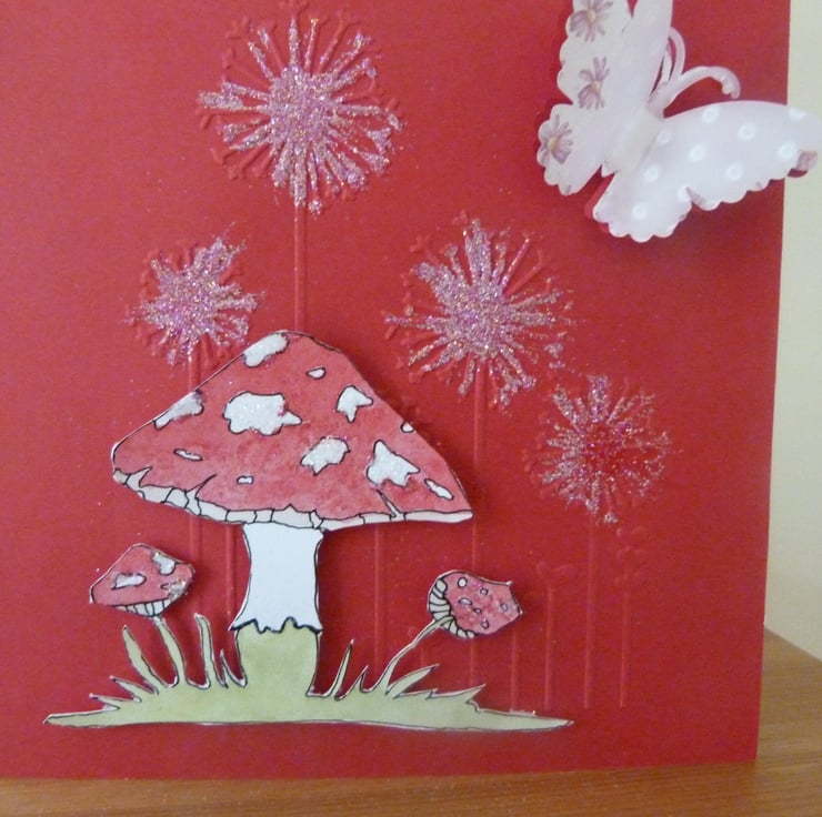 A mystical wild mushroom hand drawn and water colour painted mounted onto a bright red card which has been embossed with dandelions. Embellished with a triple layer butterfly, with layers of red card, pink flowery paper and a top layer of dotty embossed parchment. Finished off with a dusting of fine fairy glitter.