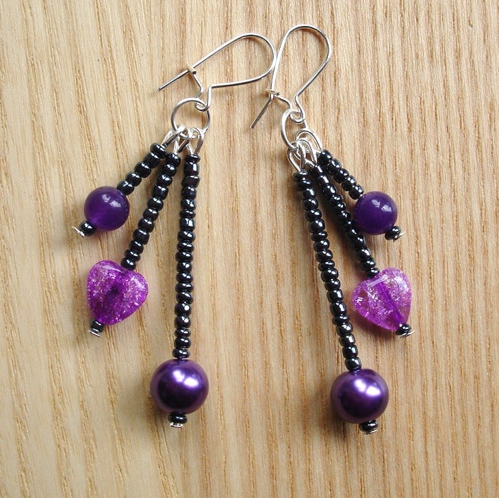 These fabulously gothic earrings feature a graduated drop of purple glass beads hung on silver plated headpins with co-ordinating black teeny glass seed beads. A deliciously dark look.