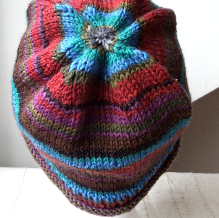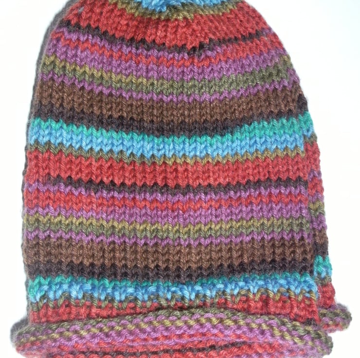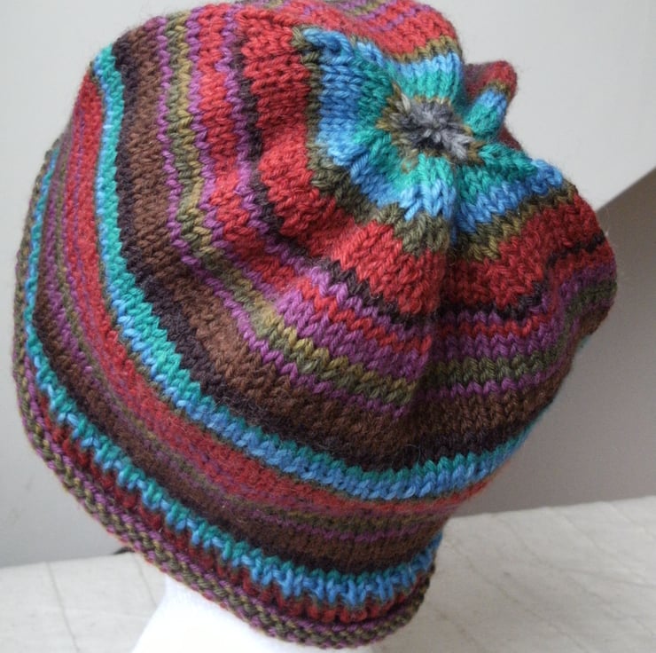 All my hats are one offs using bespoke wools from USA, Germany, Italy & Japan incorporating hand dyes and self striping yarns. They are all made on the round so there are no seams. The stripes are shown off to their full potential! Unusual colour mixes are my favourites which make them so individual.