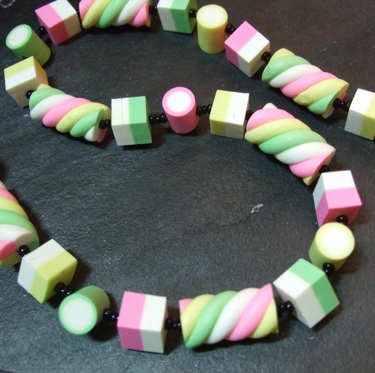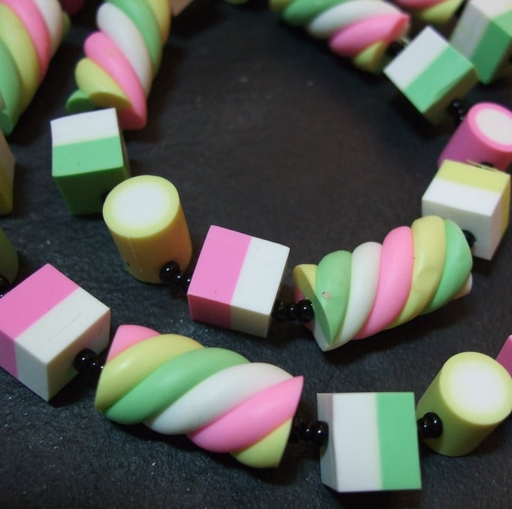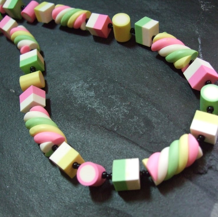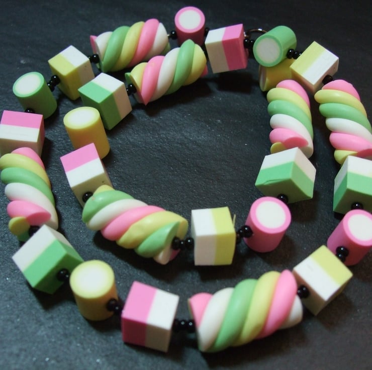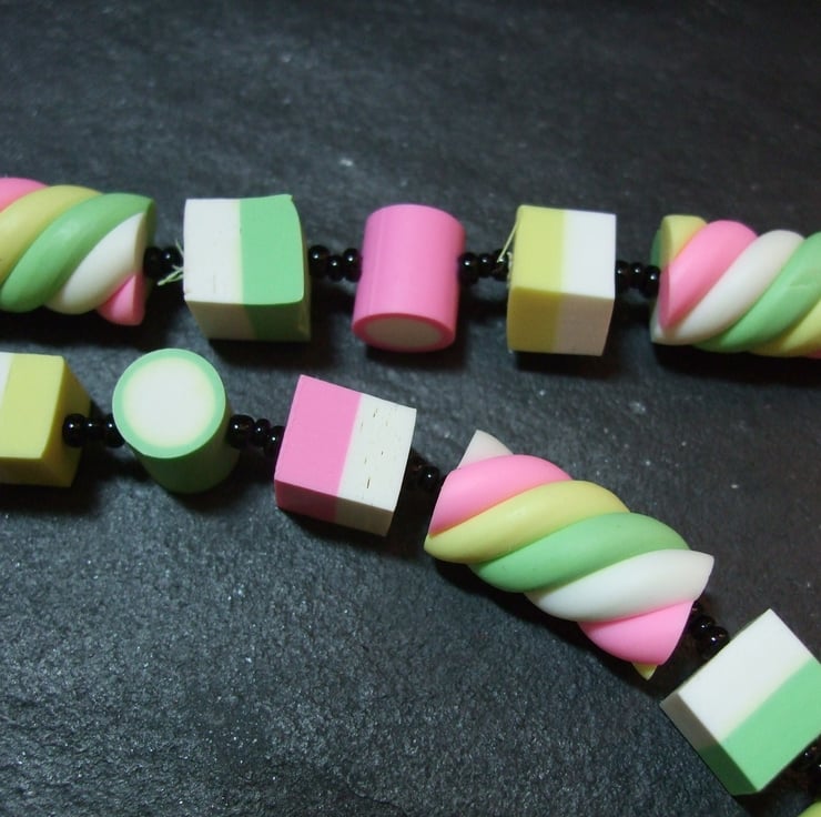 A cute, whimsical necklace from the Kitsch Creations Pick n Mix Collection, this item is lovingly constructed using a selection of extremely high quality individually hand crafted Dolly Mixture polymer clay canes and Flump marshmallow twists sourced from a UK designer off-set to dramatic effect with the simplest black seed beads and high quality black metal jewellery findings.