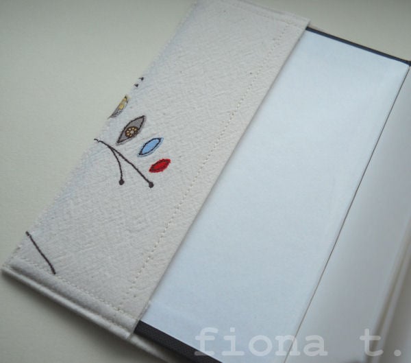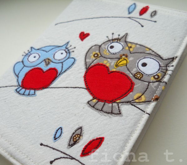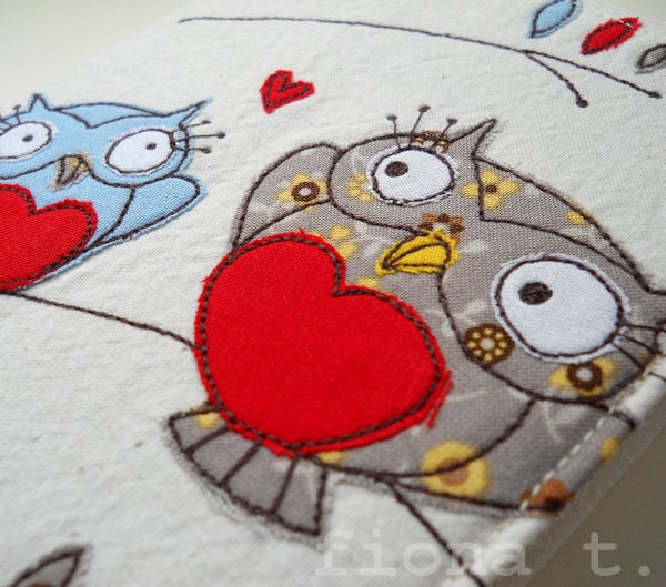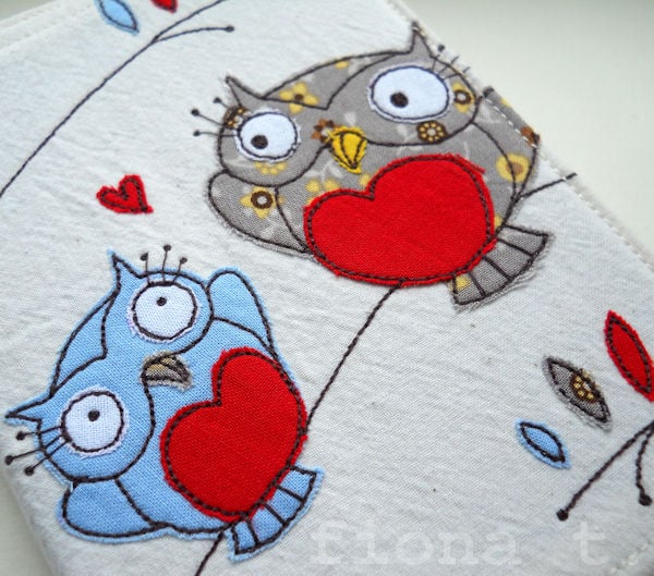 this pretty notebook cover features a pair of appliqued and embroidered owls on the front cover, based on an original drawing by Little Black Heart, and is entirely handmade by me on a domestic sewing machine.