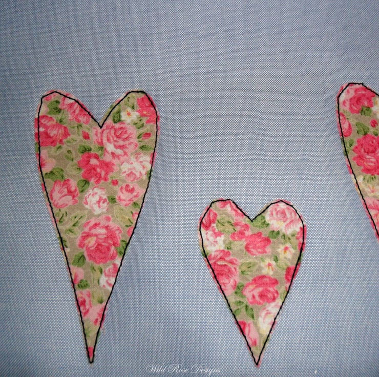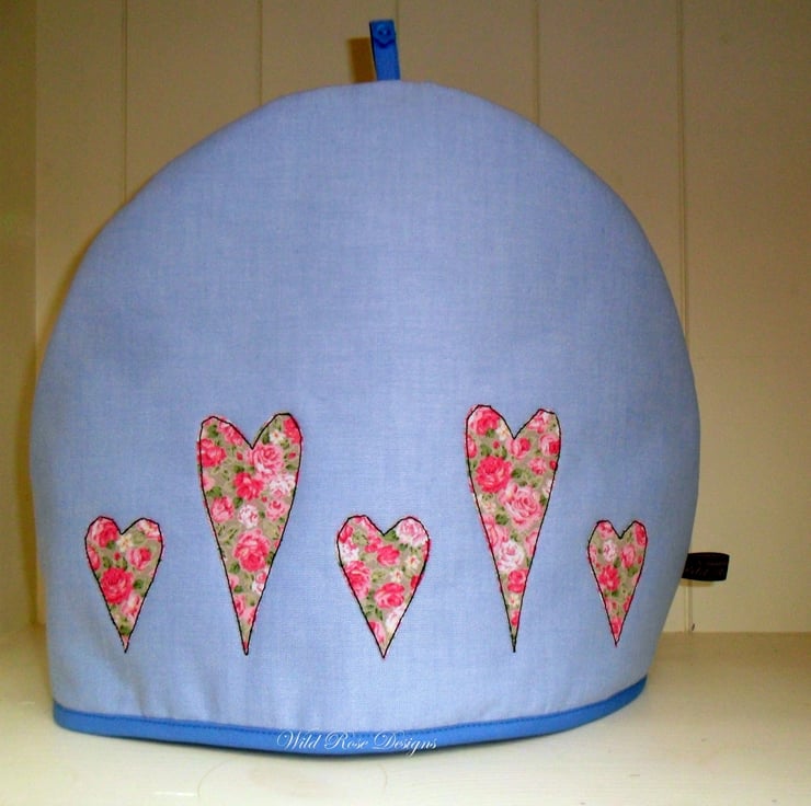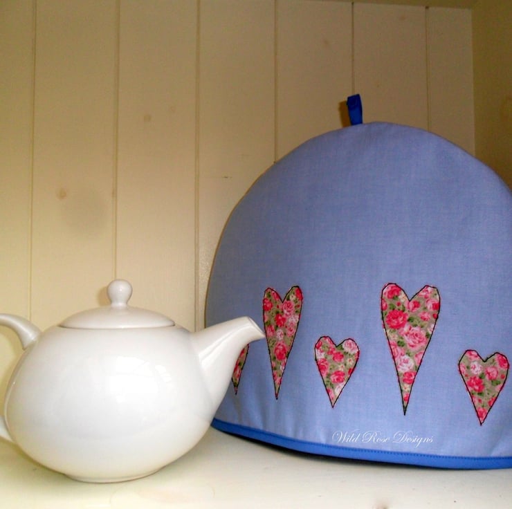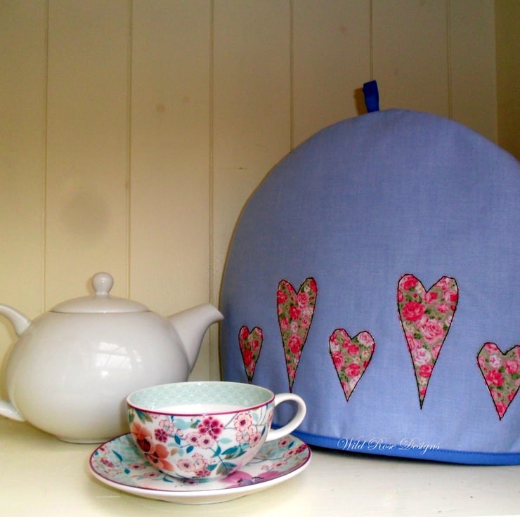 A lovely tea cosy made in a blue cotton chambray, edged with blue bias binding and appliqued with pink floral hearts. It is lined in a quilted cream cotton print and has a top tab finished with a pretty blue button. The cosy measures a generous 35cm x 28cm and contains polyester wadding to help keep your tea piping hot!