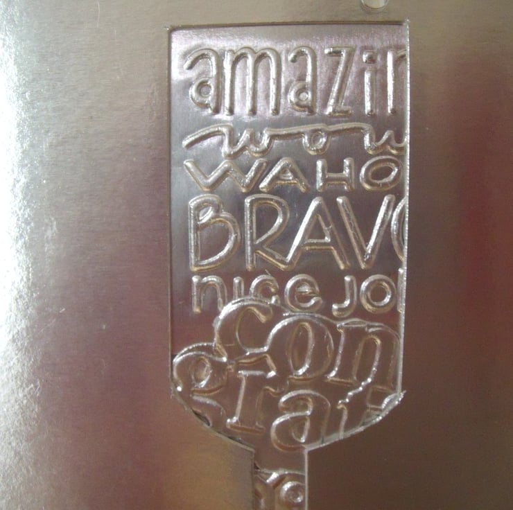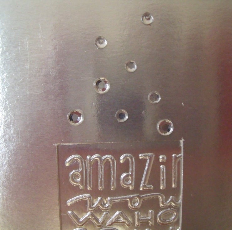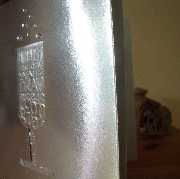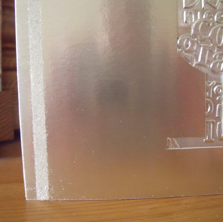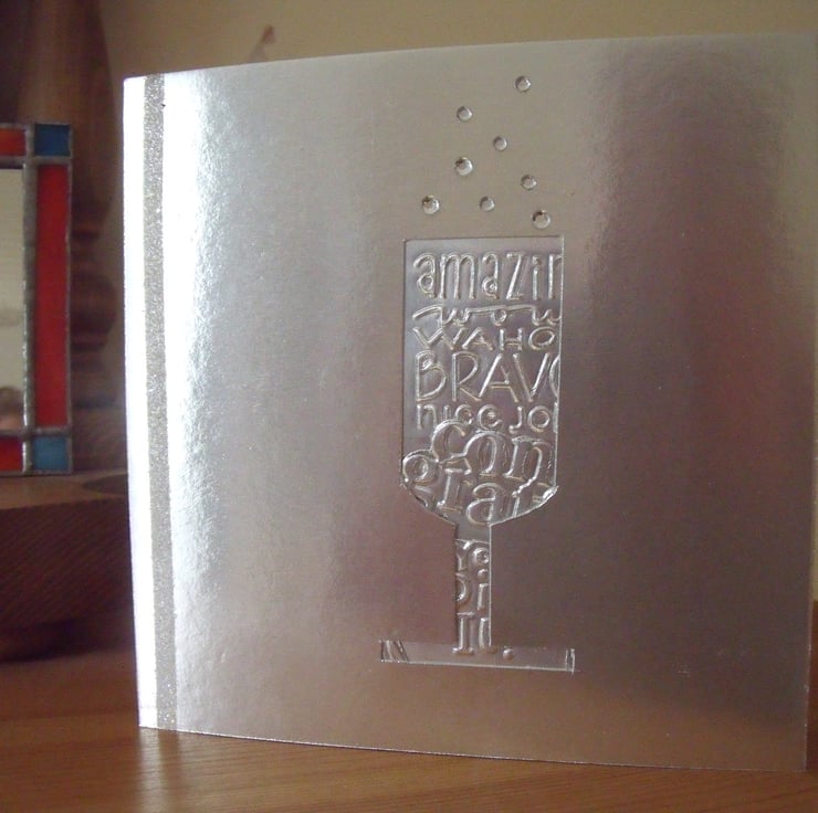 A matt silver card which has the shape of a champagne flute cut out. The aperture has been filled with embossed words - amazing, congrats, you did it, wahoo,bravo, nice job. Little crystals stuck on above glass to emulate fizzy bubbles. Silver fairy glitter embellished left side of card. All mounted onto quality white card.