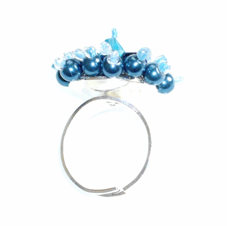 This ring is hand made from a combination of metallic blue pearl bead and 4 mm bicone crystal beads with a clear blue 6 mm bicone crystal at the centre. All are individually strung onto a silver plated ring which is adjustable to fit most ring sizes.