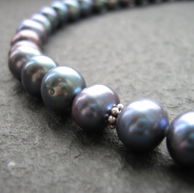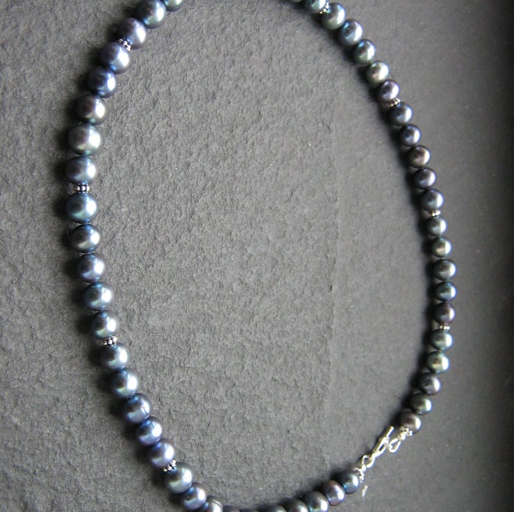 A single strand of beautiful peacock blue freshwater pearls accented with sterling silver daisy beads make up this elegant necklace in a classic design. The pearls are lovely shades of blues which change to greens and purples as they dance in the light. All metal parts are of sterling silver and the clasp is stamped 925 for purity.