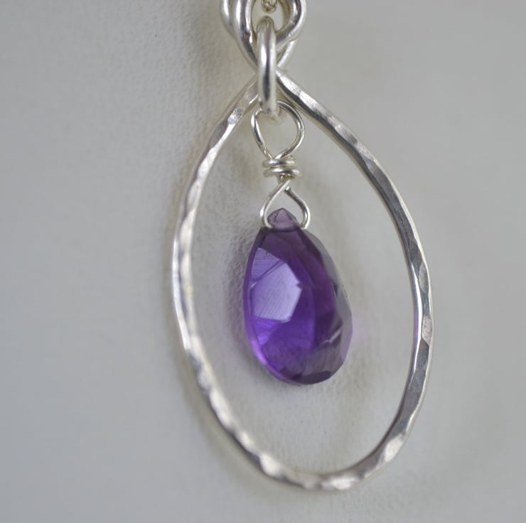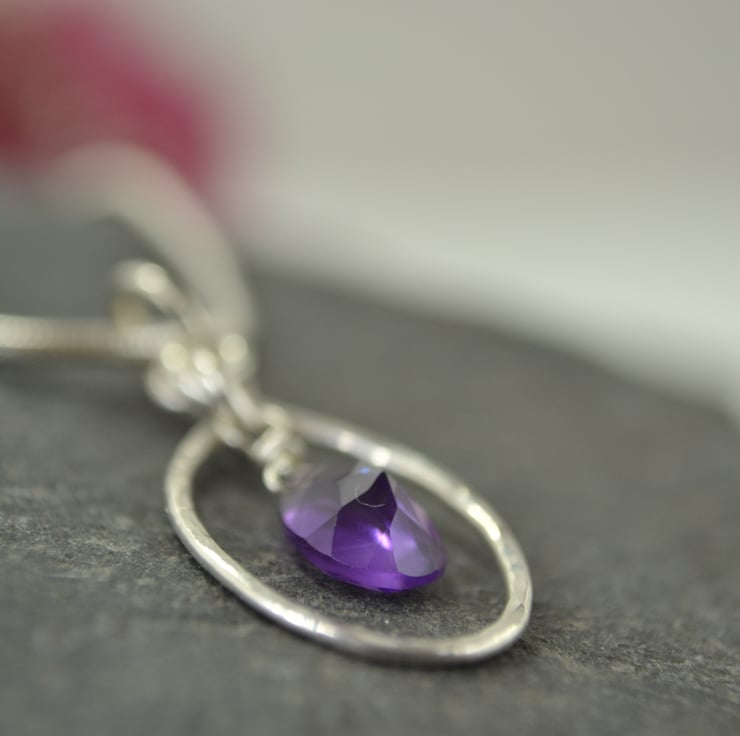 Stunning deep purple amethyst is framed in textured sterling silver and hangs from a sterling silver 16 inch snake chain.